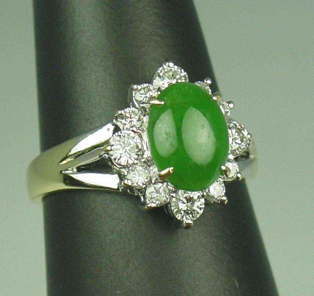 Exquisite 14 karat yellow and white gold ladies contemporary design ring set with a center fine apple green Jade 1.50 carats and surrounded by 12 round diamonds weighing approx. 0.60 carats of F-G colors and mostlyVS clarity. Retail $5,400.00 Estimate $1,500-$2,500 Please see full appraisal