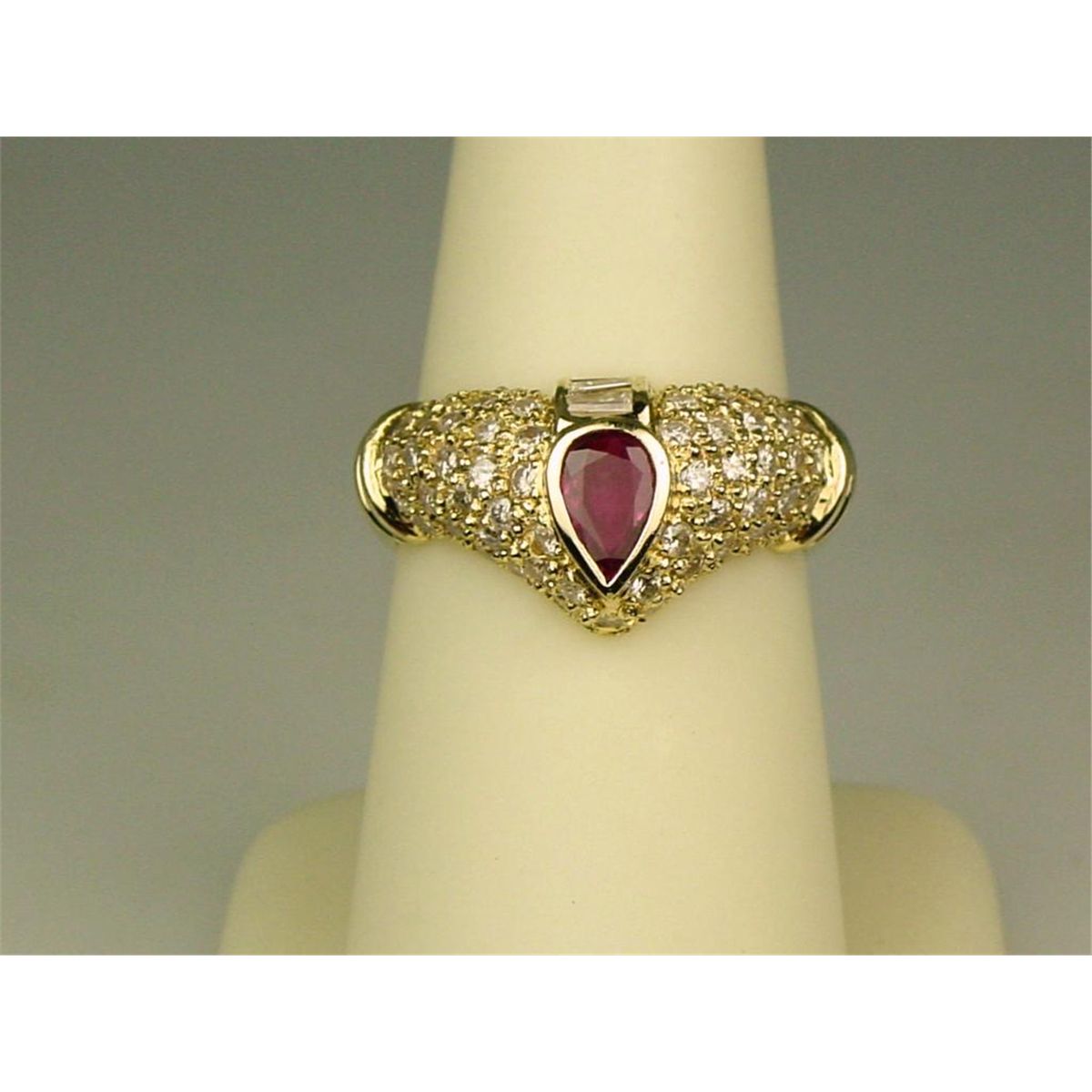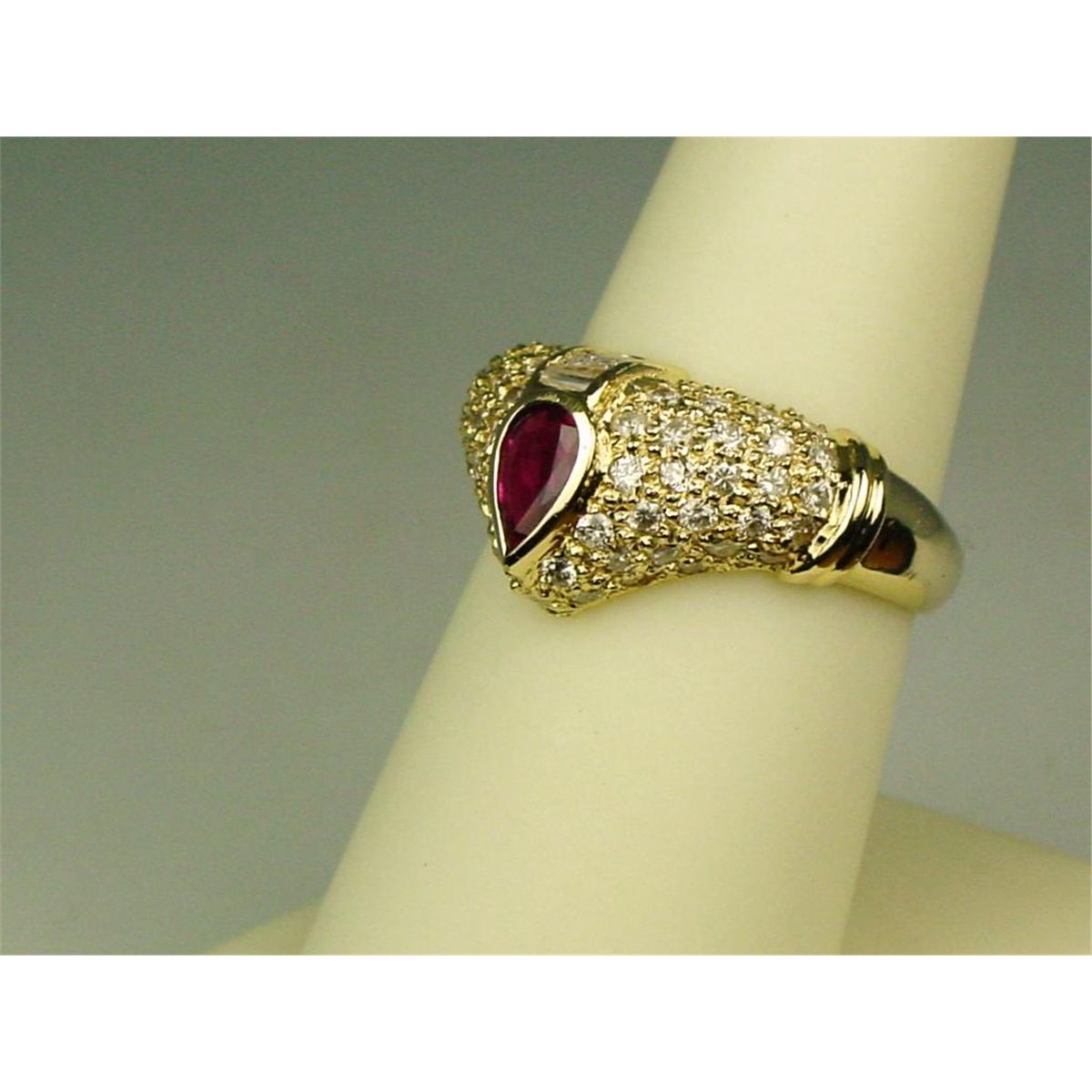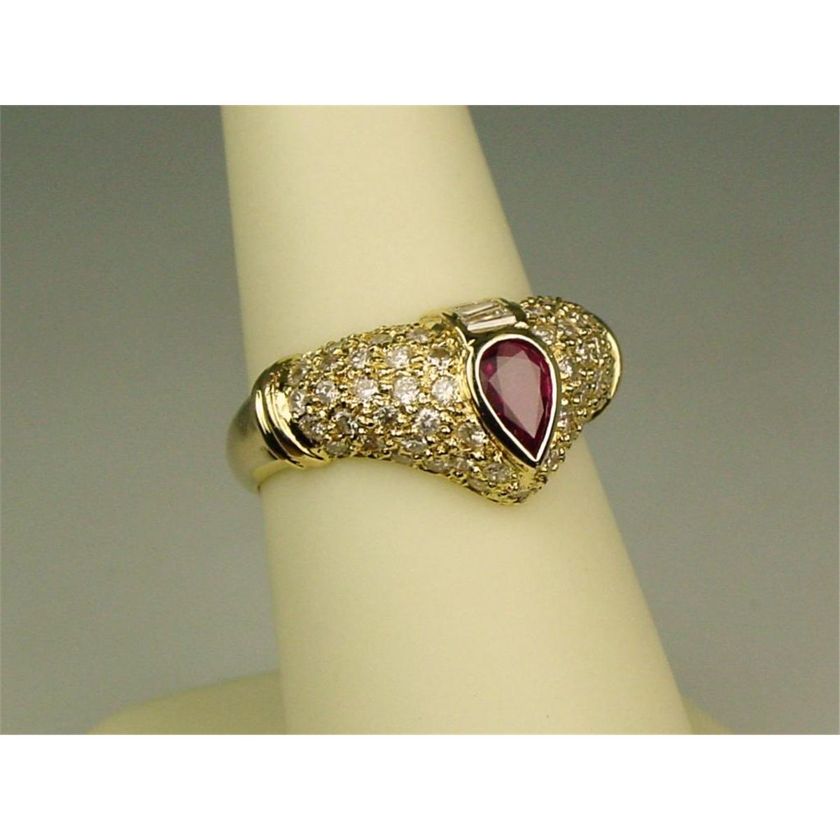Exquisite 14 karat yellow gold ladies Cartier inspired design ring bezel set with a pear shape red ruby weighing approx. 0.70 carats and pave and channel set with over 65 round and baguette cut diamonds weighing approx.1.50 carats of G-H colors and VS/SI clarity. Retail $2,500-$3,500 Estimate $1,500-$2,000 A fine item