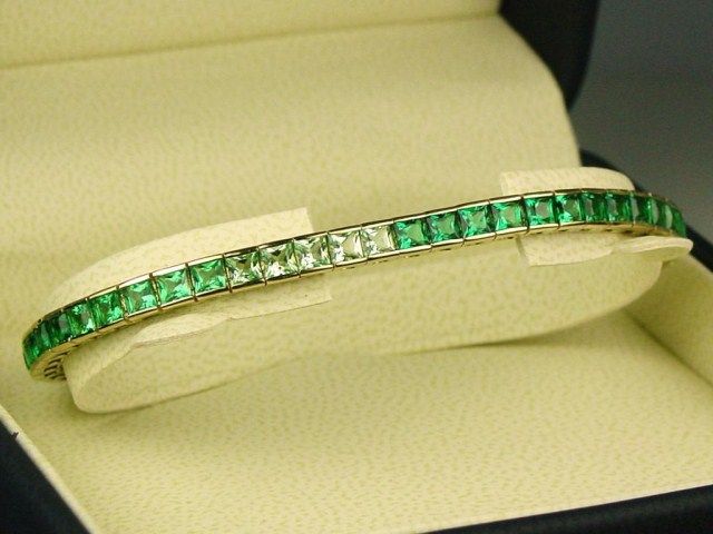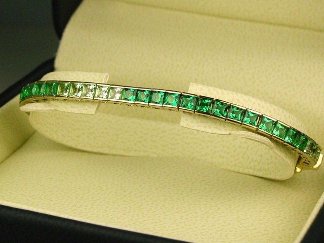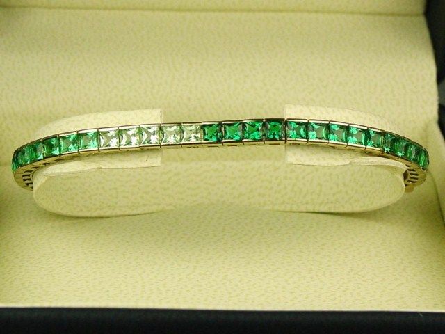 Exquisite 14 karat yellow gold ladies bracelet channel set with over 56 princess cut different shades of green Tsavorite Garnets weighing approx. 7.00-9.00 carats Retail $3,000-$4,000 Estimate $2,000-$3,000Labor intensive