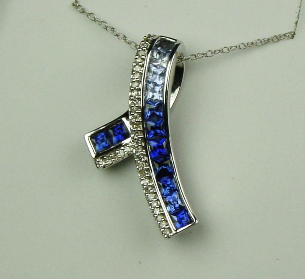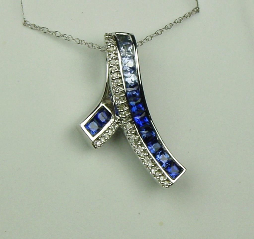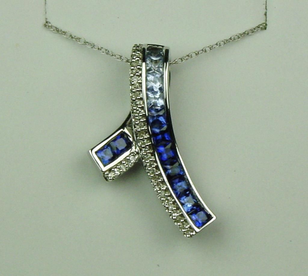 Channel set with 13 princess cut sapphires weighing approx 1.50 carats and 32 round diamonds weighing approx 0.25 carats of G-H colors and VS clarity. Retail $1,200-$1,800