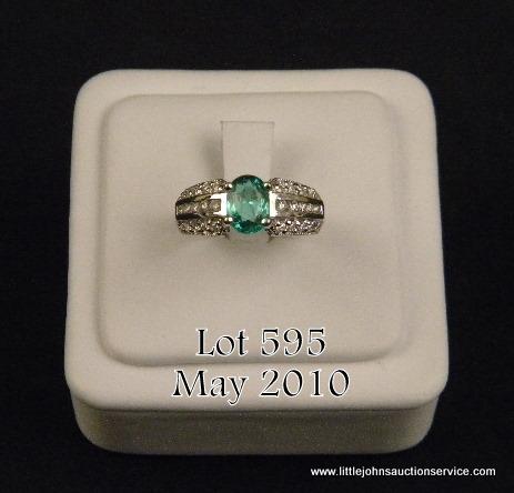 Exquisite 18 karat white gold ladies custom made ring set with a center Paraiba like teal color tourmaline weighing over 1.00 carat and fine set with 30 round ideal cut diamonds weighing approx. 0.90 carats of F-G colors and VVS/VS clarity.Retail $2,450.00 Estimate $800-$1,200 A fine item. Paraiba like color tourmalines are becoming very rare and expensive.