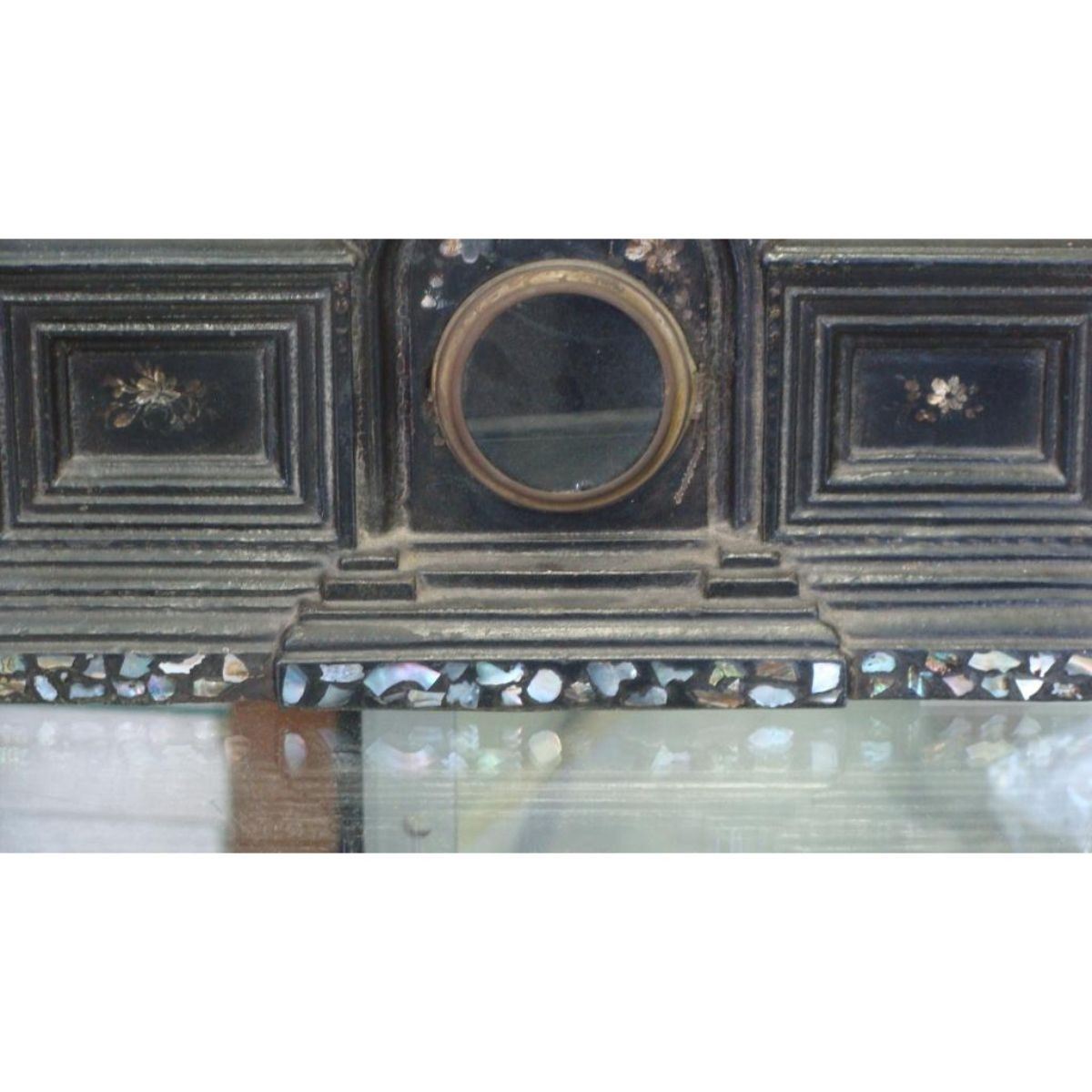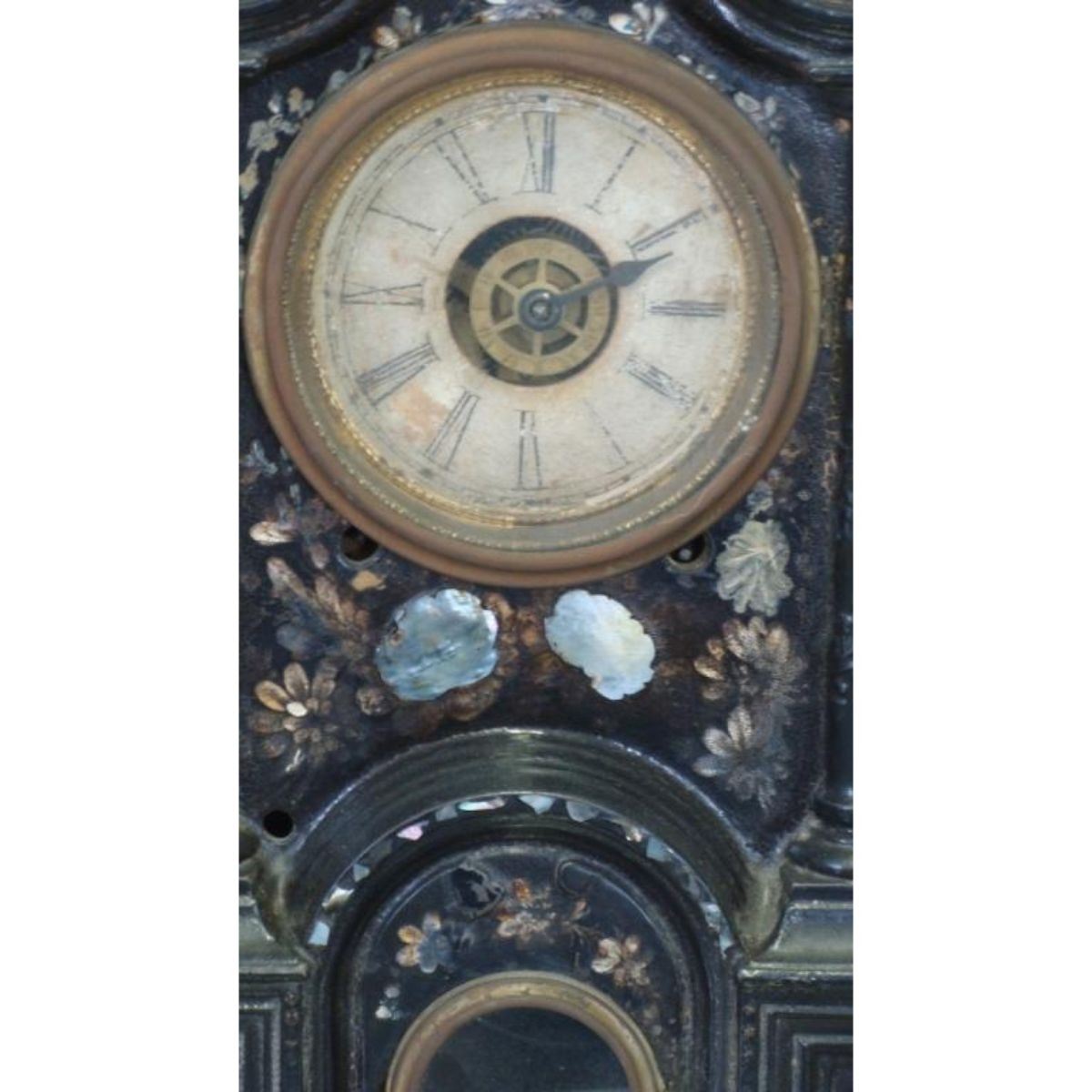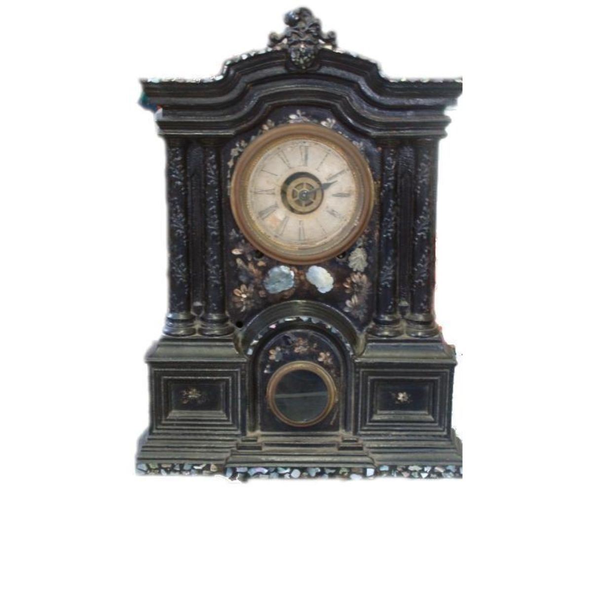 Exquisite early example of a cast iron Ansonia mantel clock. Mother of pearl inlay & floral embellishments. Only needs cleaning to be in working order. 18 1/2" X 12 1/2" W.