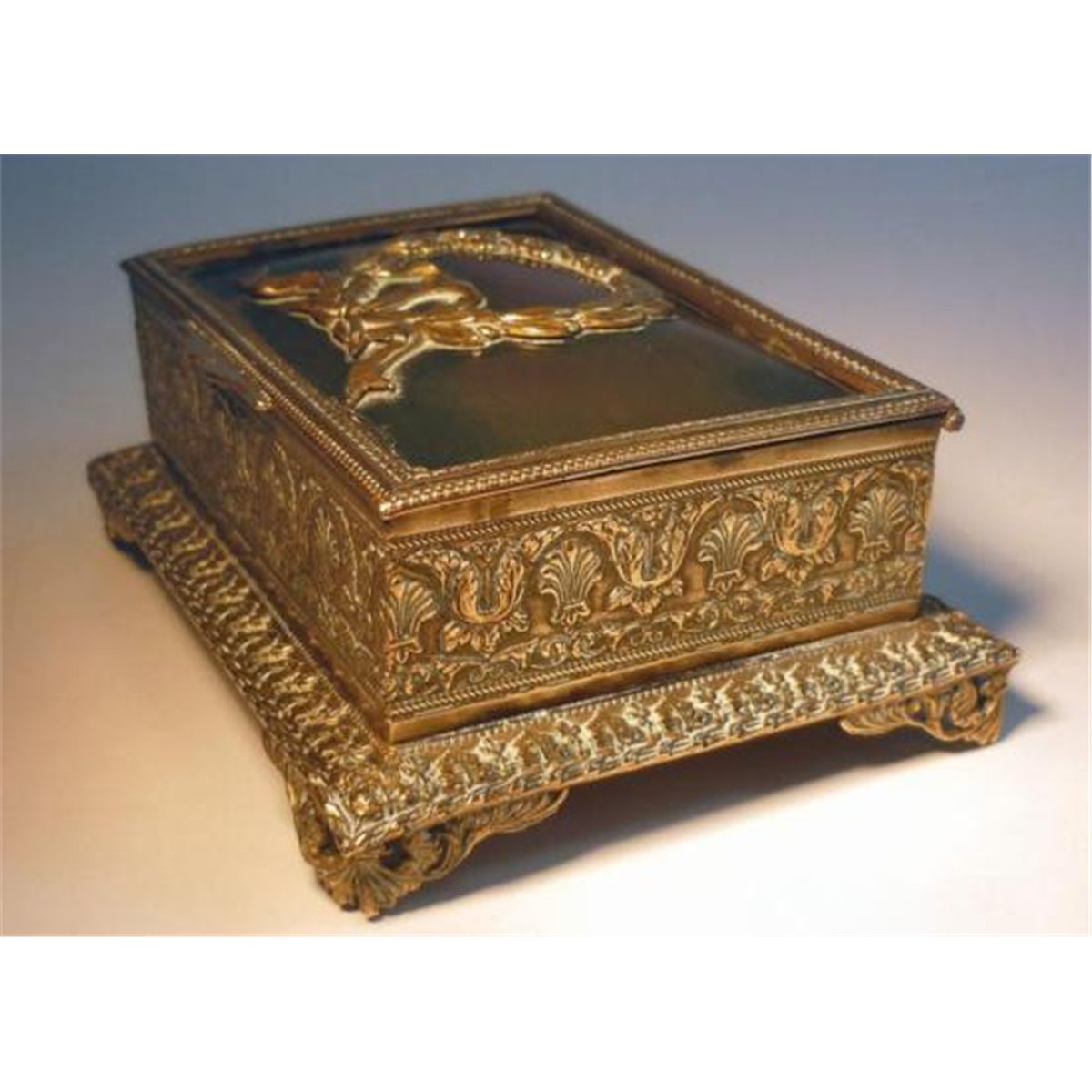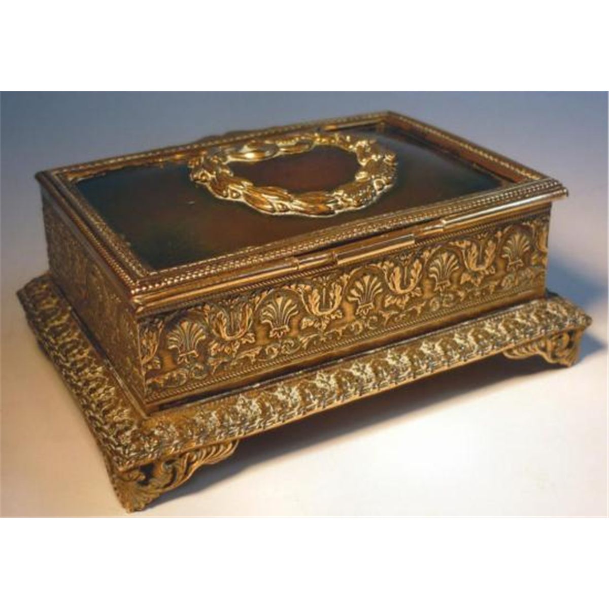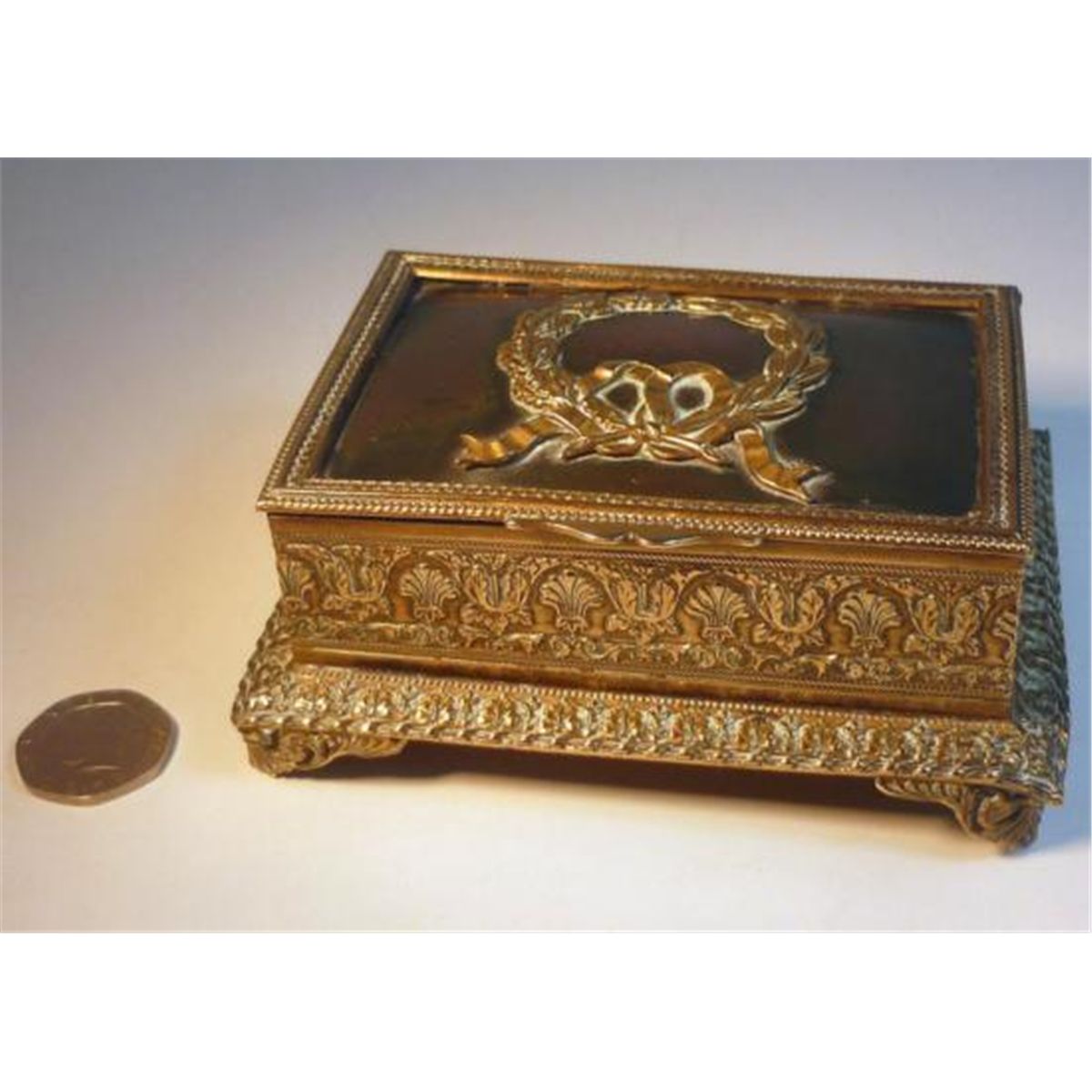 ANTIQUE GEORGIAN FRENCH T/SHELL & BRASS CASKET, This lovely original Georgian miniature casket is a delight with its tortoise shell & brass laurel wreath lid surrounded by a double beaded border and cute little sculpted thumb piece. ~C~ scroll and floral relief decoration in a rope border all around, Base with floral decoration, Four fabulous intricately pierced & scrolled feet, The padded interior is original and hand embroidered with garlands of flowers. Dimensions, 4 1/4 in long x 3 1/4in deep x 1 3/4 in high