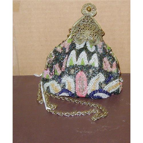 Exquisite colorful beaded purse for evening wear with art deco or art nouveau design. Inside hand sewn blue lining in fair condition. Its base is blach beading with pink, green and white flowers and designs. The top closure is gold metal filigree. The chain looks newer than the purse. Buyer pays shipping and handling costs.