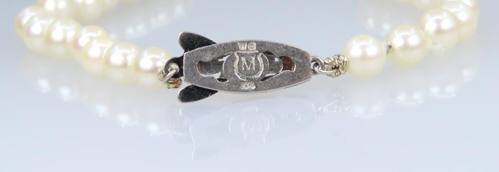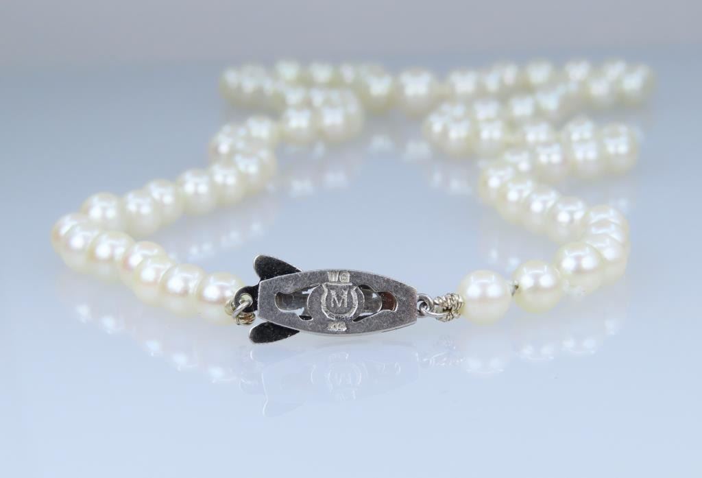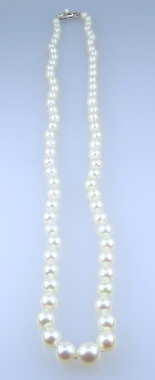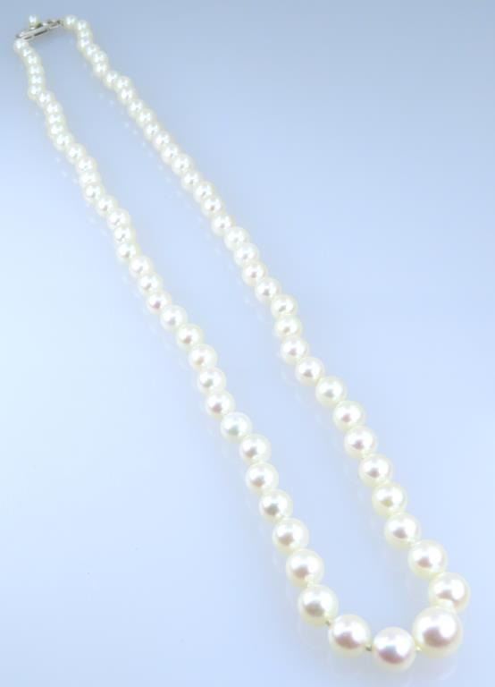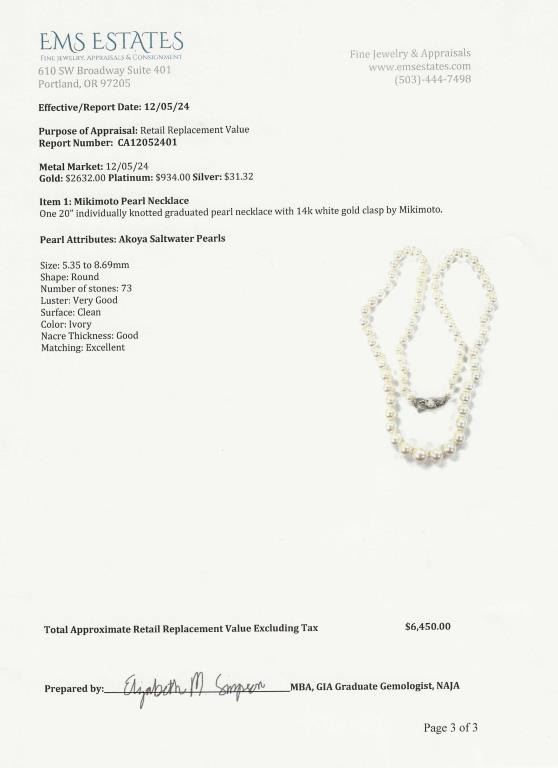 Necklace featuring natural graduating Akoya Saltwater Pearls ranging from 5.35 MM to 8.69 MM signed MIKIMOTO logo on a 14 karat white gold clasp. Full Appraised Retail Value - $6,450.00 A non-signed similar necklace sold at Heritage Auctions for over $40,000.00