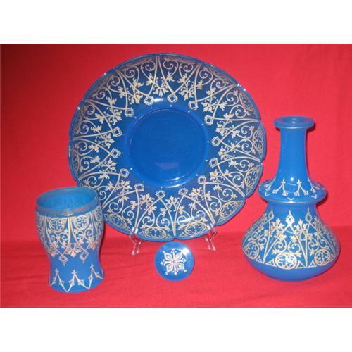 This is an exceptional Decanter set in beautiful Blue Opaline glass with Enamel paint on from France in excellent condition. The underplate is with scalloped rim. Whole thing together H: 9" - cup's H:4.50" W:3.25" - Decanter H:8" W:5" - Plate's edge H:1.50" W:9.75" .