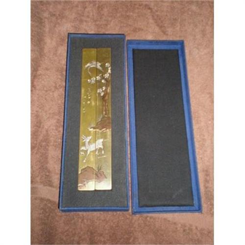 Exquisite Bronze Framing Weights. This is Japanese style with silver tone and copper tone overlay. It depicts a cherry blossom tree with crane and goat. It is signed in Japanese Characters. It is used to hold scrolls or any paper down for framing. They would make excellent decorative paper weights today. They are very beautiful, excellent tones, and very decorative. Practical and charming. Check this one out!