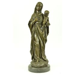 The bronze sculpture captures the saintly Madonna and Child. There are several distinct types of representation of the Madonna but the fulllength stan