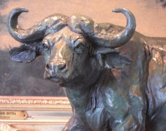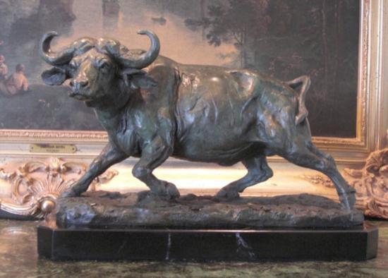 Cape Water Buffalo Bronze Sculpture, After Barye 14"L x 10"H x 14"W32 lbs. This bronze sculpture was produced using the "Lost Wax" casting method. The"Lost Wax" Cast method is the most precise metal casting technique in existence, ensuring exquisite detail of the original host model which is usually sculpted in clay or wax. This "Lost Wax" casting method is an extremely labor intensive and expensive process, but the end results produce a Heirloom Quality Masterpiece!Antoine-louis Barye (1796 - 1875) Originally trained as a goldsmith, Antoine-Louis Barye served in Napoleon's army before studying sculpture and painting. He entered the Ecole des Beaux-Arts in 1818 and adapted the romantic-style subject matter of violent and majestic animals. After his crocodile-like sculpture entitled Tiger Devouring a Gavail, won a medal at the Salon of 1831, Barye became a successful and independent sculptor and painter. His animal sculptures competed at the Salon alongside the more traditional and revered human figures. In 1845, Barye began a foundry that produced smaller and more affordable bronze statues. He was appointed the keeper of plaster casts at the Louvre and professor of zoological drawing at the Musee National d'Histoire Naturelle, both in Paris. Elected to the Academie in 1868, Barye inspired a later generation of animal sculptors who called themselves the animaliers.The Water Buffalo or domestic Asian water buffalo (Bubalus bubalis) is a large bovine animal, frequently used as livestock in Asia, and also widely in South America, southern Europe, north Africa, and elsewhere.In 2000, the United Nations Food and Agriculture Organization estimated that there were approximately 158 million water buffalo in the world and that 97% of them (approximately 153 million animals) were in Asia. There are established feral populations in northern Australia but the dwindling true wild populations are thought to survive in India, Pakistan, Nepal, Bhutan, and Thailand. All the domestic varieties and breeds descend from one common ancestor, the Wild Water Buffalo, which is now an endangered species.Buffalo are used as draft, meat, and dairy animals. Their dung is used as a fertilizer and as a fuel when dried. In Chonburi, Thailand, and in South Malabar Region in Kerala, India, there are annual water buffalo races. A few have also found use as pack animals carrying loads even for special forces.American bison are known as buffalo in parts of North America, but not normally in other usages; bison are more closely related to cattle, gaur, banteng, and yaks than to Asian buffalo. The water buffalo genus includes water buffalo, tamaraw and anoas-all Asian species. The ancestry of the African buffalo is unclear, but it is not believed to be closely related to the water buffalo.