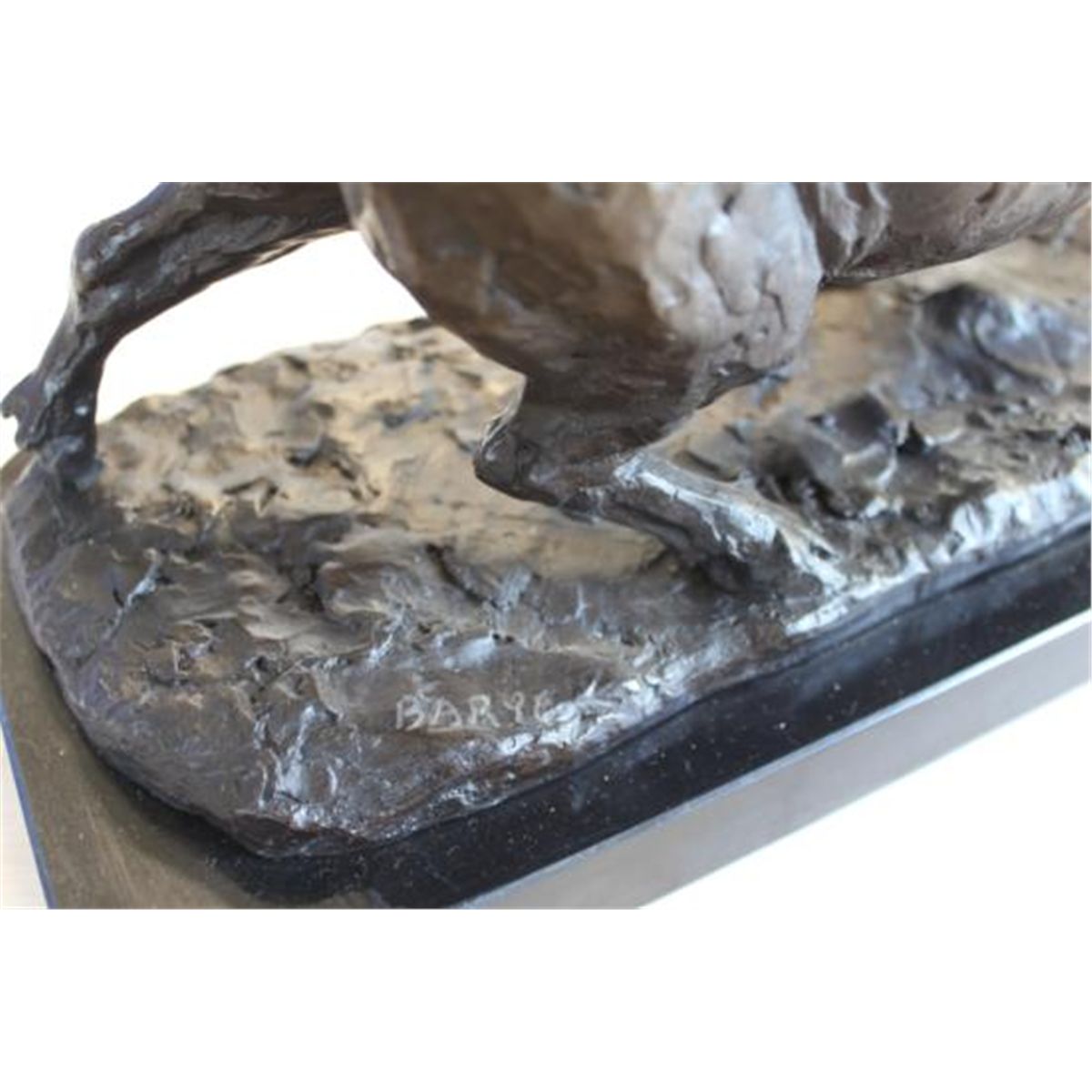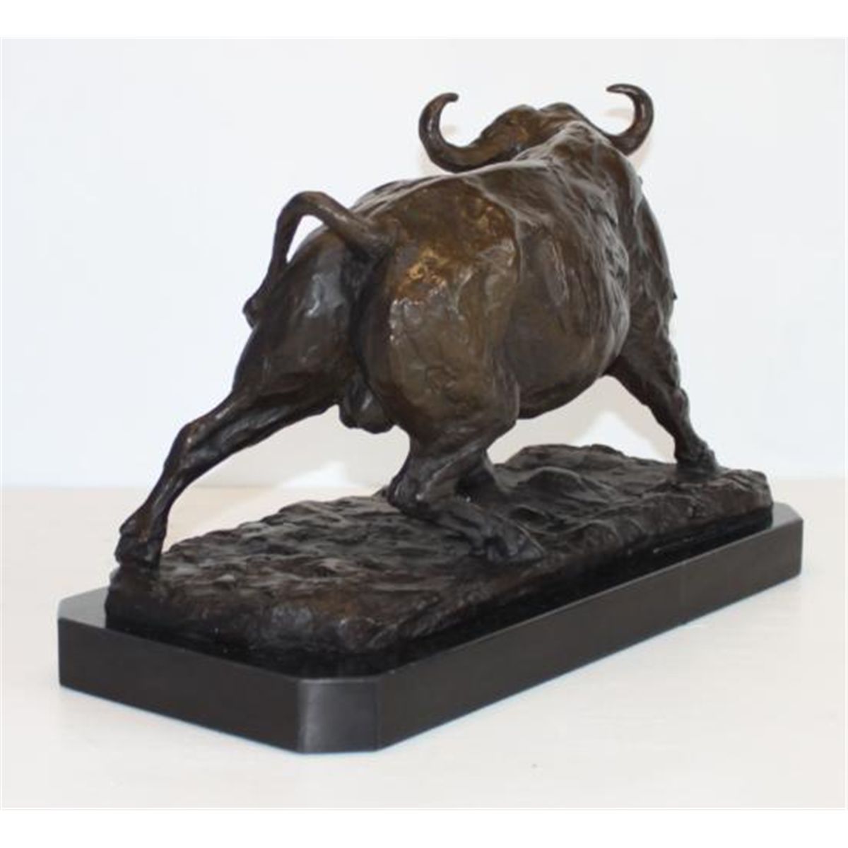 Cape Water Buffalo Bronze Sculpture, After Barye 14"L x 10"H x 14"W32 lbs. This bronze sculpture was produced using the "Lost Wax" casting method. The"Lost Wax" Cast method is the most precise metal casting technique in existence, ensuring exquisite detail of the original host model which is usually sculpted in clay or wax. This "Lost Wax" casting method is an extremely labor intensive and expensive process, but the end results produce a Heirloom Quality Masterpiece!Antoine-louis Barye (1796 - 1875) Originally trained as a goldsmith, Antoine-Louis Barye served in Napoleon's army before studying sculpture and painting. He entered the Ecole des Beaux-Arts in 1818 and adapted the romantic-style subject matter of violent and majestic animals. After his crocodile-like sculpture entitled Tiger Devouring a Gavail, won a medal at the Salon of 1831, Barye became a successful and independent sculptor and painter. His animal sculptures competed at the Salon alongside the more traditional and revered human figures. In 1845, Barye began a foundry that produced smaller and more affordable bronze statues. He was appointed the keeper of plaster casts at the Louvre and professor of zoological drawing at the Musee National d'Histoire Naturelle, both in Paris. Elected to the Academie in 1868, Barye inspired a later generation of animal sculptors who called themselves the animaliers.