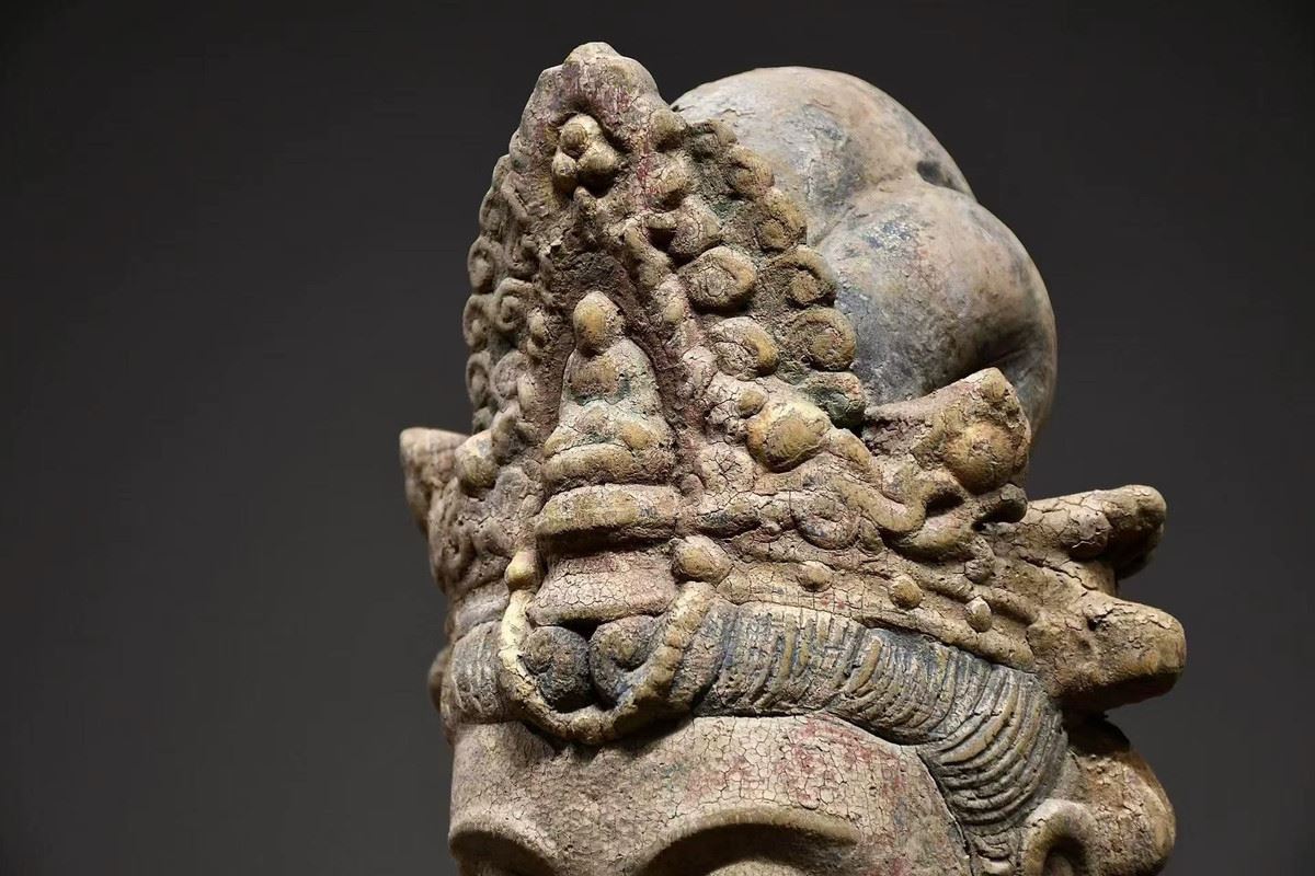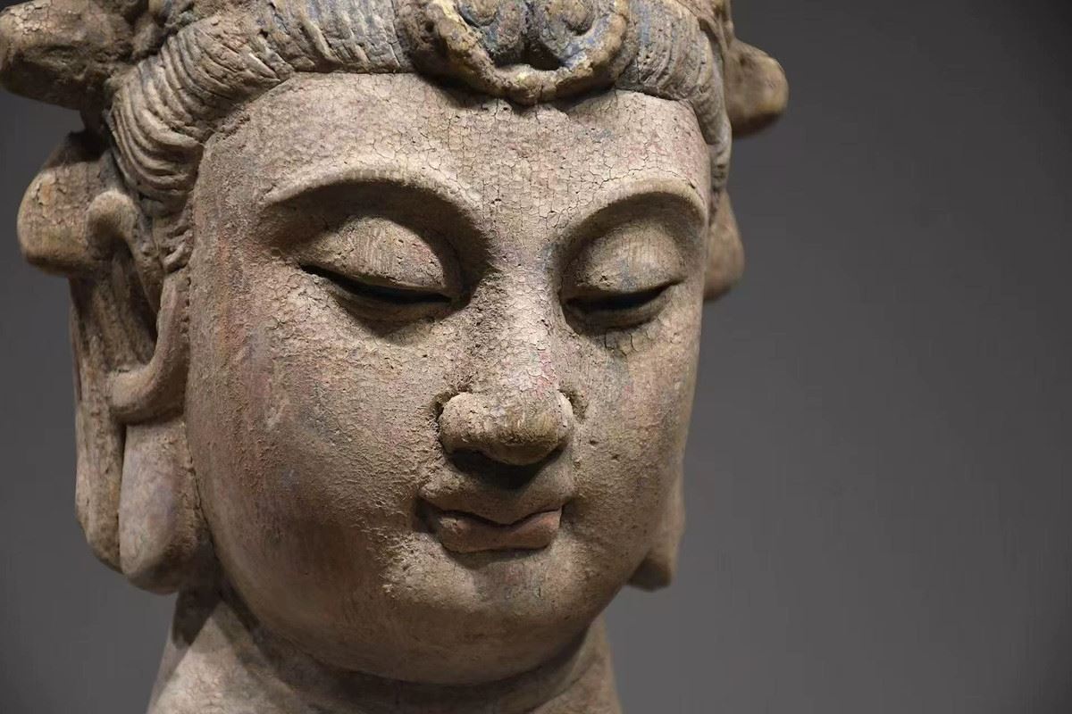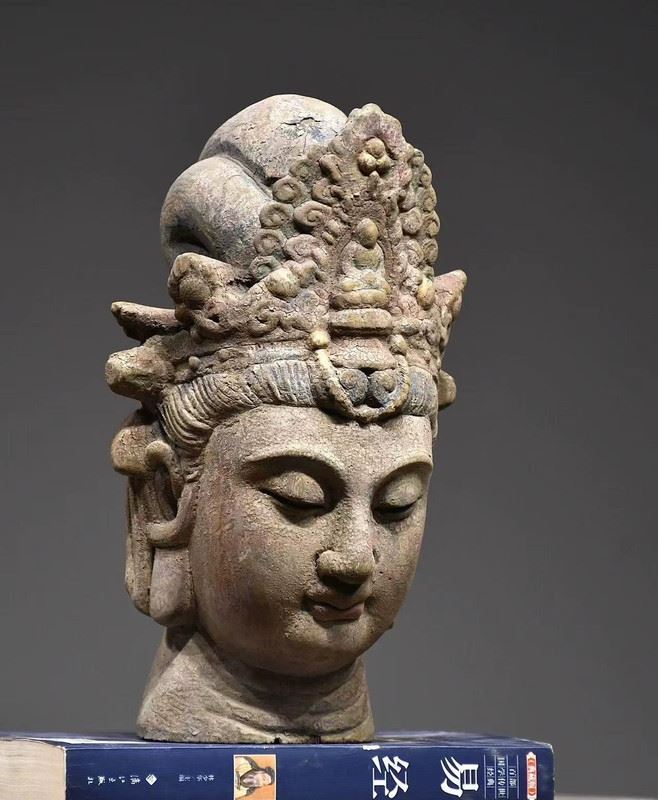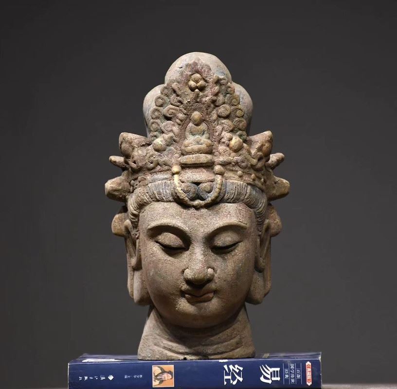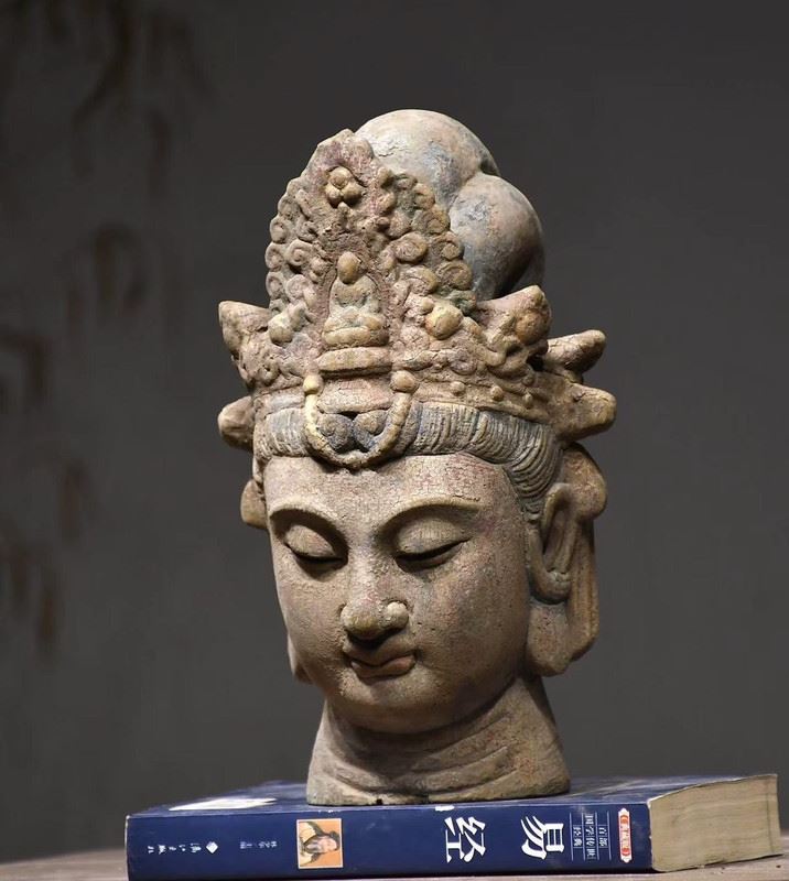 This is a detailed carving of a Buddha head, showcasing exquisite craftsmanship. The serene expression, with slightly closed eyes, symbolizes wisdom and compassion. The intricate design of the crown on top highlights the unique charm of Buddhist art.