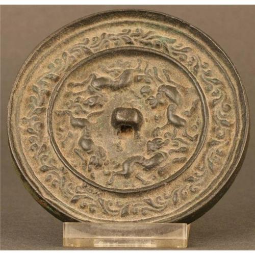 </font></strong>A Splendidly Designed Chinese Han Dynasty Bronze Mirror with Lions in Relief Enwreathed with a Beautiful Floral Decoration. The Han Dynasty was from 206 BC - 220 AD. A fine example from a renowned and published New York collection. Purchased 20 years ago from Andy Ng of Singapore. 3.25 inches (8 cm) diameter.</font>