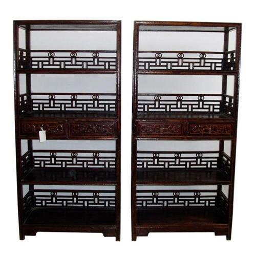 The antique furniture is a couple of exquisite chinese Qing dynasty's bookshelf made of wood gathered from Hebei province in China.A wonderful piece for a room that can hold it.At the beginning of the Qing Dynasty, furniture followed Ming patterns and styles.Qing Furniture showed its own uniqueness with the absorption of western art. It was larger in size with grandeur and pageantry.Engraving was a popular and important means of furniture decoration. The subjects range from auspicious character patterns, to geometric patterns and scenes in nature with animals, mountains and waters, flowers and grass. Color painting, especially gold painting, was widely used.Commercial symbols emerged, such as patterns concerning money and fortune.To later Qing furniture has less engraving ,instead ,inlays of stone, which catch the eye more easily than exquisite engraving, are used to tell of the luxurious lifestyle of the owner. In addition, color and gold painting become the vogue depicting the preference for gaudiness by the wealthy.