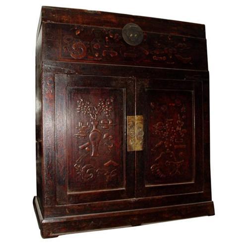 The antique furniture is a piece of exquisite chinese Qing dynasty's suitcase cabinet made of wood gathered from Hebei province in China.A wonderful piece for a room that can hold it.At the beginning of the Qing Dynasty, furniture followed Ming patterns and styles.Qing Furniture showed its own uniqueness with the absorption of western art. It was larger in size with grandeur and pageantry.Engraving was a popular and important means of furniture decoration. The subjects range from auspicious character patterns, to geometric patterns and scenes in nature with animals, mountains and waters, flowers and grass. Color painting, especially gold painting, was widely used.Commercial symbols emerged, such as patterns concerning money and fortune.To later Qing furniture has less engraving ,instead ,inlays of stone, which catch the eye more easily than exquisite engraving, are used to tell of the luxurious lifestyle of the owner. In addition, color and gold painting become the vogue depicting the preference for gaudiness by the wealthy.