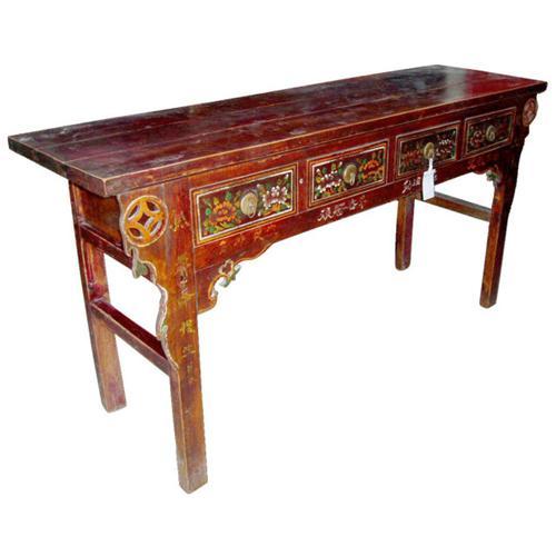 The antique furniture is a piece of exquisite chinese Qing dynasty's console table made of wood gathered from Hebei province in China.A wonderful piece for a room that can hold it.At the beginning of the Qing Dynasty, furniture followed Ming patterns and styles.Qing Furniture showed its own uniqueness with the absorption of western art. It was larger in size with grandeur and pageantry.Engraving was a popular and important means of furniture decoration. The subjects range from auspicious character patterns, to geometric patterns and scenes in nature with animals, mountains and waters, flowers and grass. Color painting, especially gold painting, was widely used.Commercial symbols emerged, such as patterns concerning money and fortune.To later Qing furniture has less engraving ,instead ,inlays of stone, which catch the eye more easily than exquisite engraving, are used to tell of the luxurious lifestyle of the owner. In addition, color and gold painting become the vogue depicting the preference for gaudiness by the wealthy.