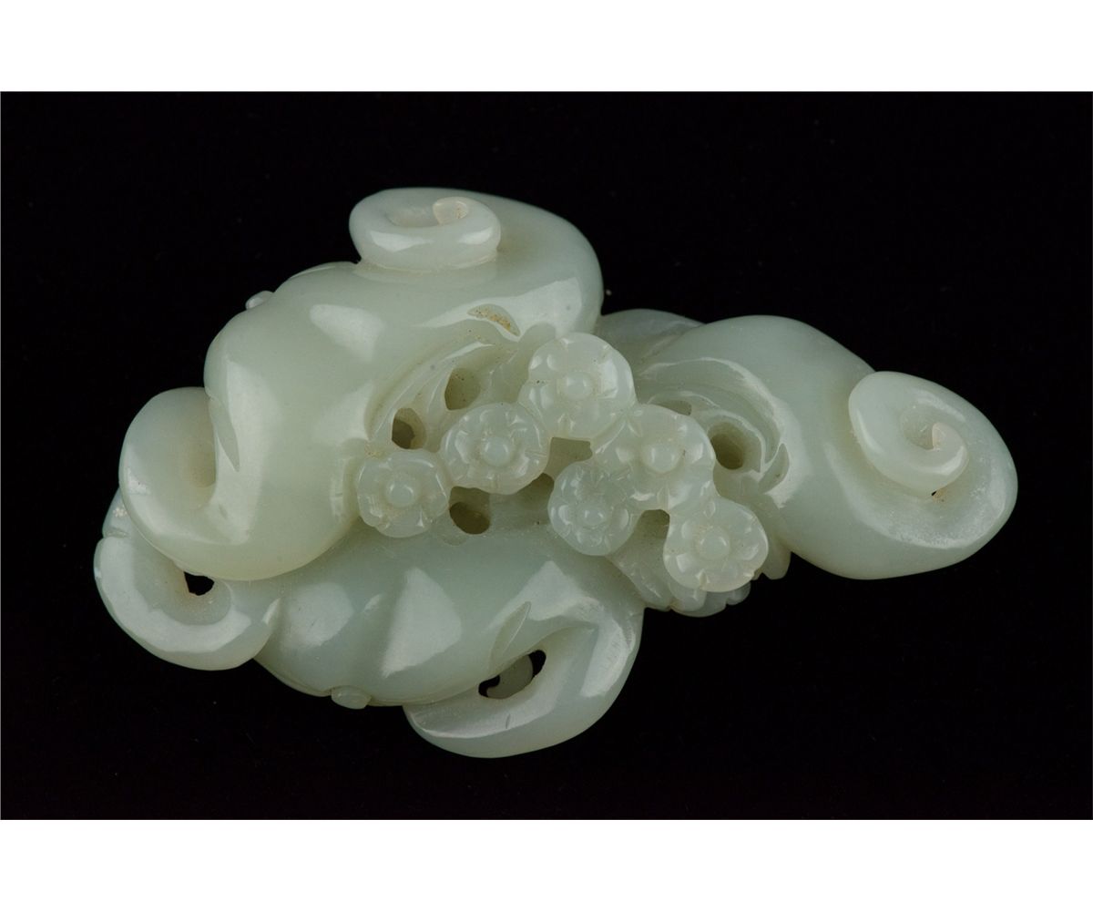 Charming Chinese white jade carvings, featuring cluster of auspicious lingzhi laying subtly amongst fruits. With high polished finish. W: 5.7 cm, L: 9 cm, 96 grams. Provenance: T. Ng Collection Toronto.