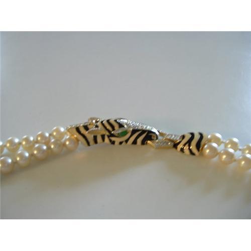 The Clasp on this Double Strand is Astounding! It is a stylized Zebra in Gold Metal, Rhinestones and Enamel. The Clasp mechanism is hiden in the design. The Clasp measures 3-1/2" long by 1" at the widest point. The Length of the Necklace is 37" with a 17" drop. It is LONG! The Beads are hand tied and measure 3/8" in diameter. This is Ciner Quality Craftsmanship and Design. Ciner has been in business since 1892 and makes exquisite, fashion jewelry.