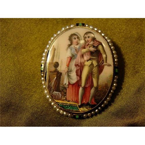 Exquisite Circa 1900 Oval shaped enamel miniature memorial - beautifully rendered set in 14kt yellow gold frame strung pearl and black green surmount. ABSOLUTELY BEAUTIFULLY DONE!!! Excellent condition. Lovely fine details. A rare find!