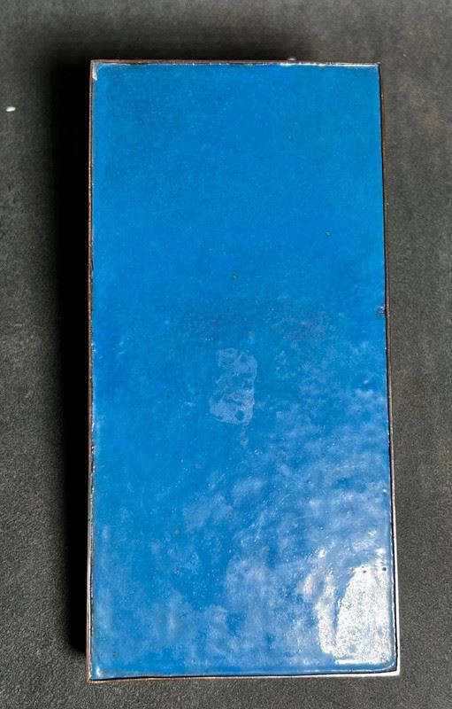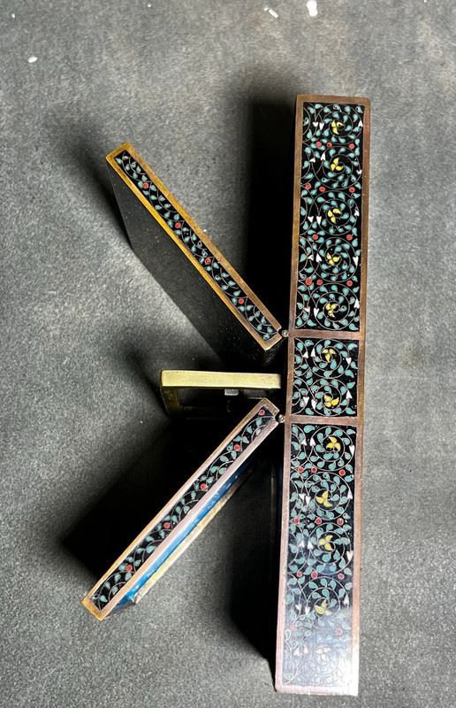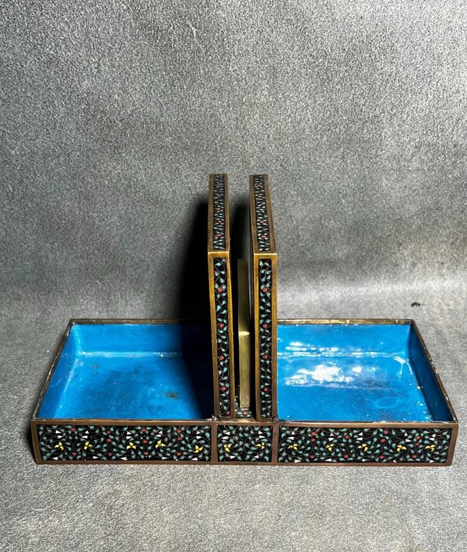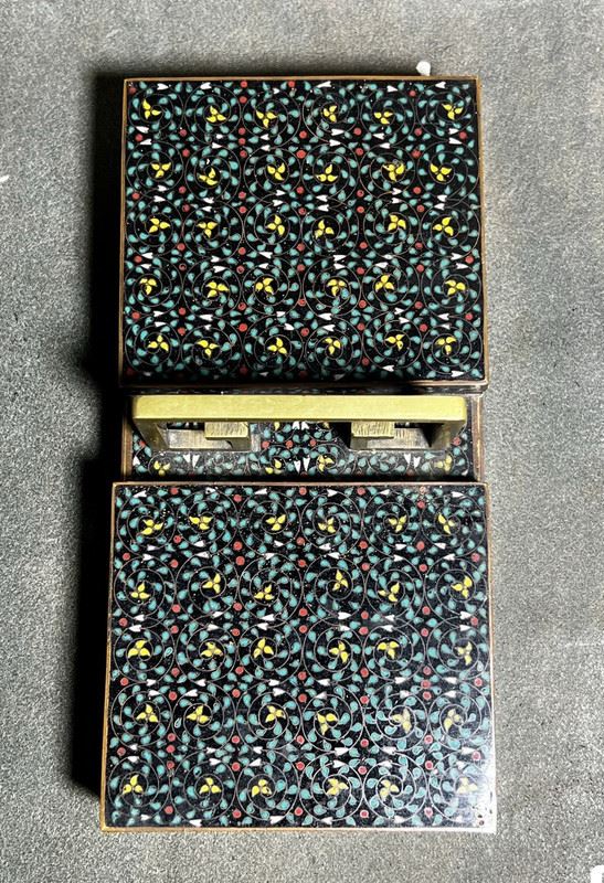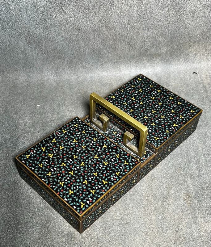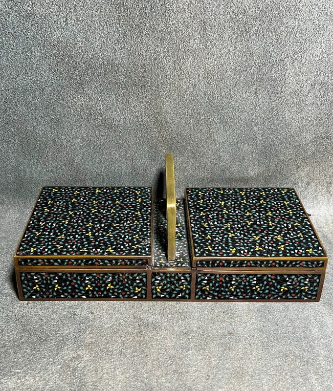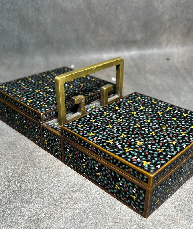 This fine cloisonné enamel box is crafted in the form of a double-compartment basket with a central handle. The entire surface is decorated in the hundred flowers motif, densely enameled with multicolored blossoms over a black ground, creating a vibrant yet harmonious effect. Meticulously made, the piece serves both as a practical storage container and as an elegant scholar’s desk ornament, embodying refined artistry and cultural taste.