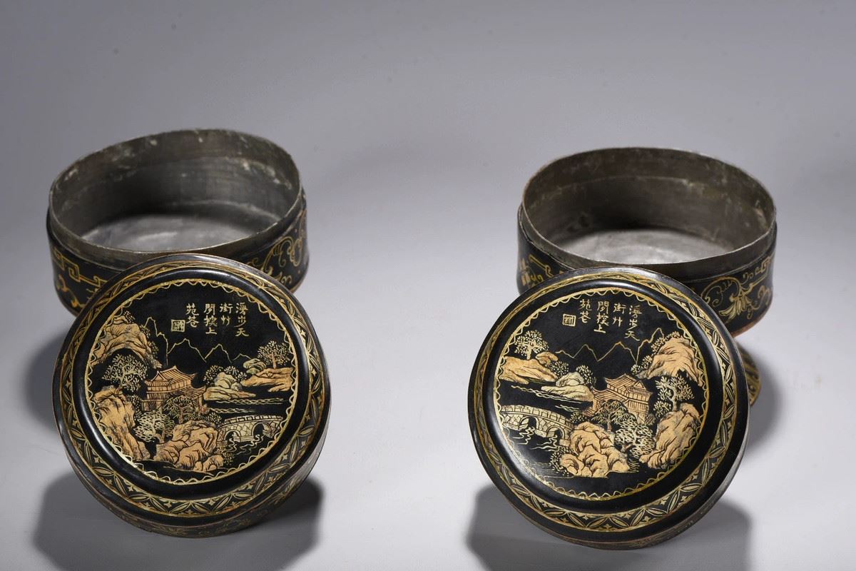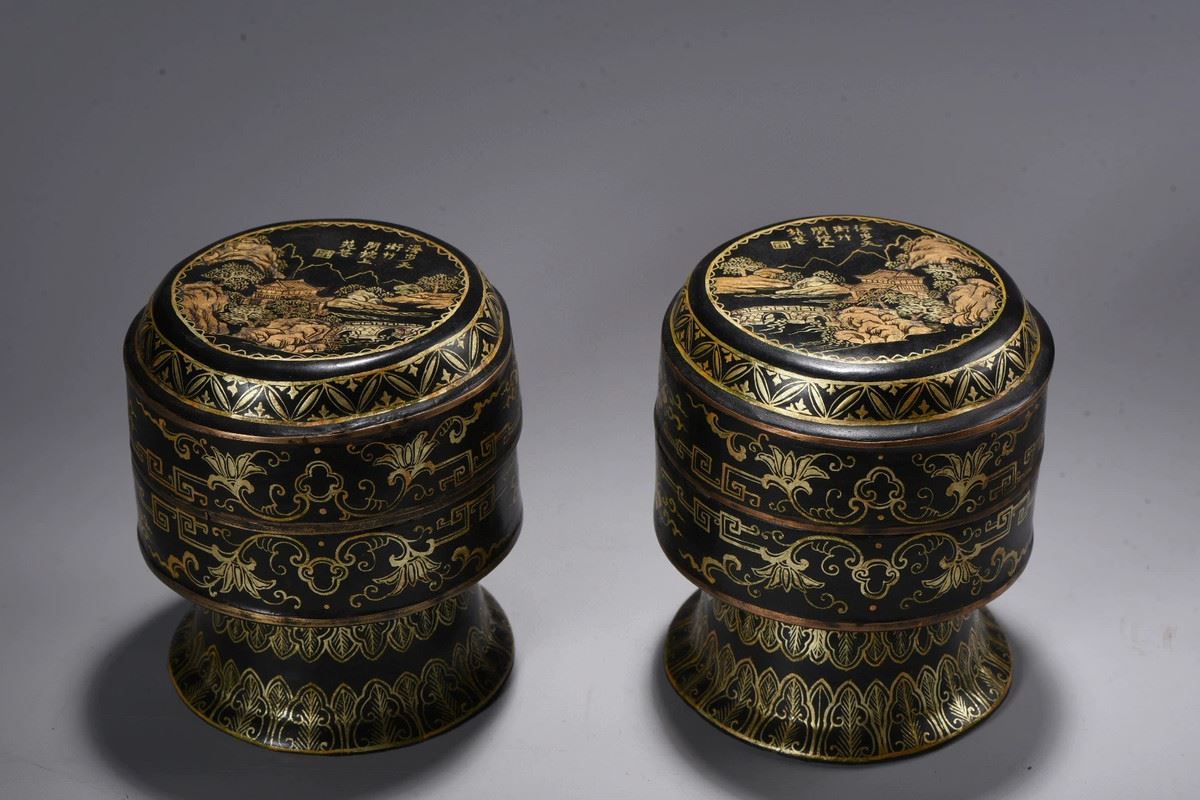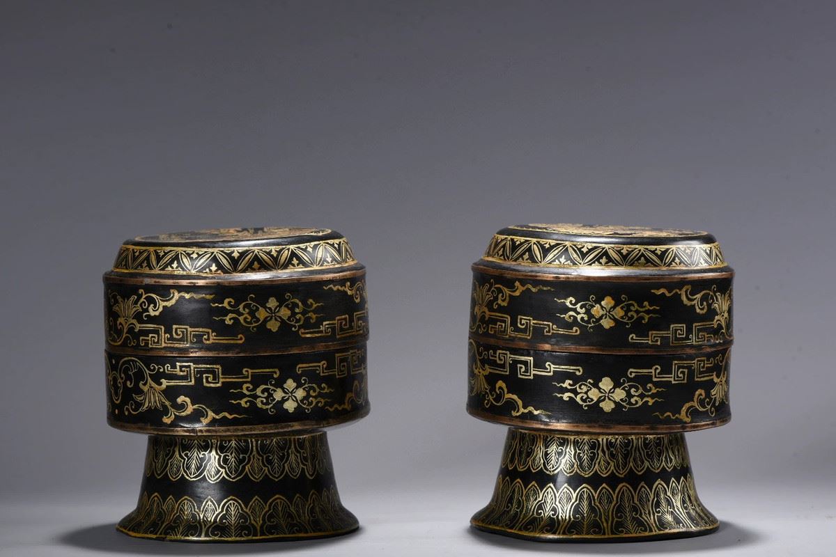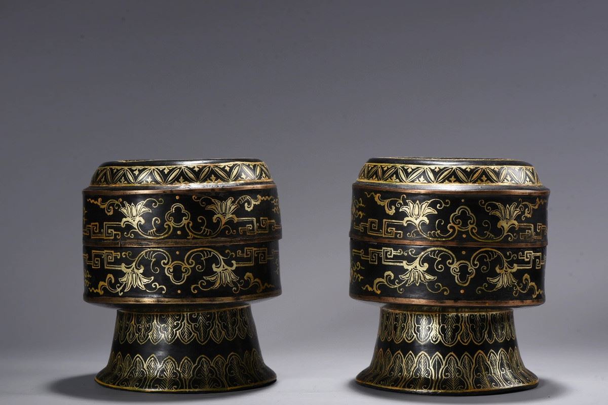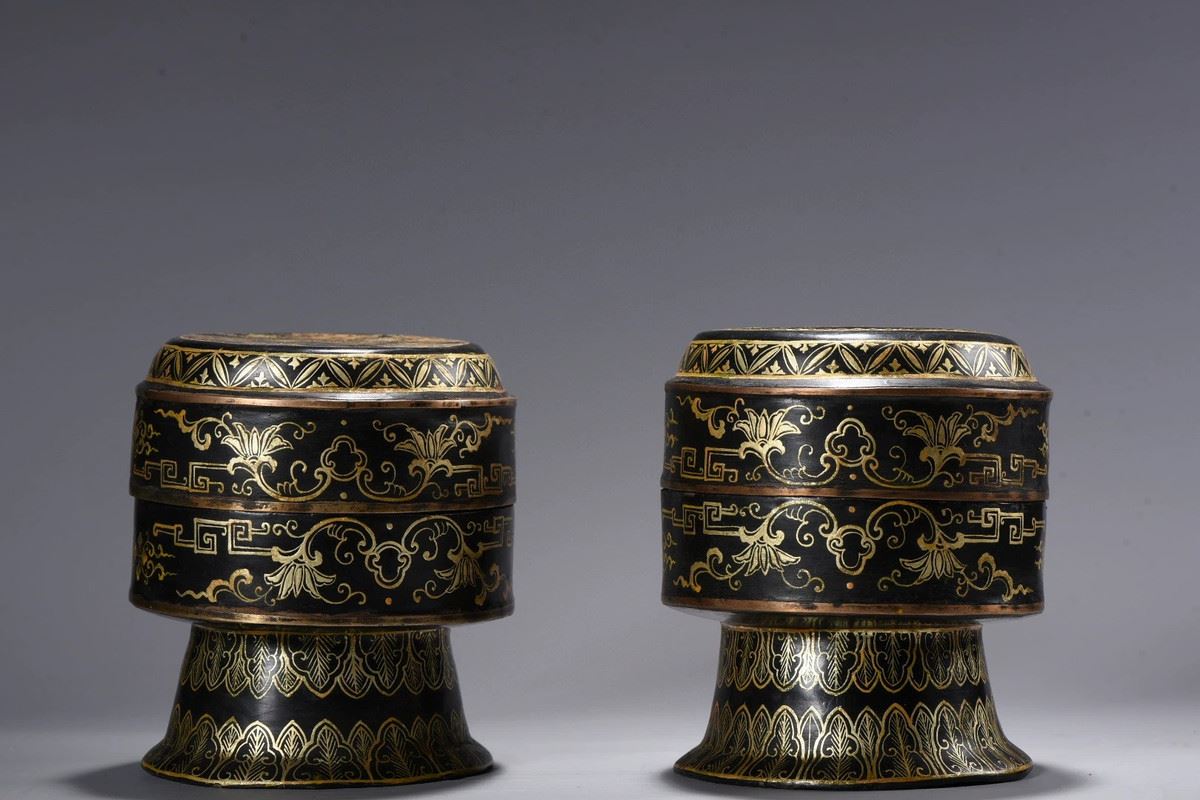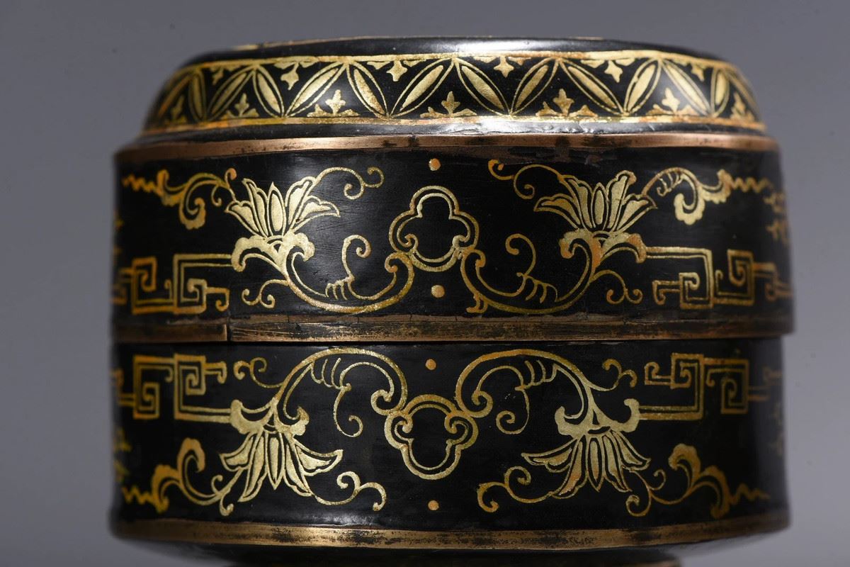 This is a beautifully designed box, featuring intricate golden floral and symmetrical geometric patterns. Its unique design and craftsmanship highlight the refined techniques of ancient art, offering both functionality and ornamental value, making it an ideal container for storing precious items.