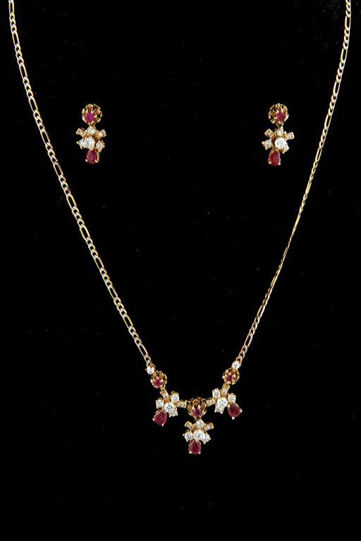 Exquisite Diamond and Ruby Necklace & Earrings Necklace and earrings have 2Ct VVS E Diamonds and 2 1/2Ct of high grade Ruby's. Necklace is a 17" 14K yellow gold chain.Necklace and earrings have 2Ct VVS E Diamonds and 2 1/2Ct of high grade Ruby's. Necklace is a 17" 14K yellow gold chain.