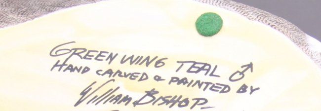 Exquisite Duck Decoy, "Green Wing Teal", signed William Bishop. Hand painted and carved capturing every feather and minute details. (Size: See last photo for measurement.)