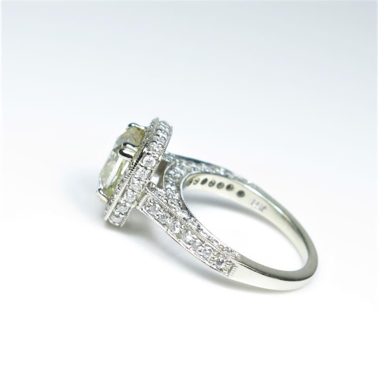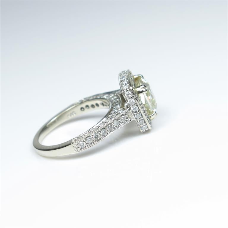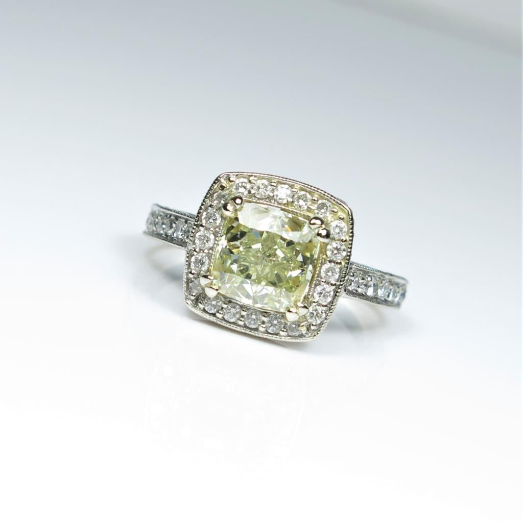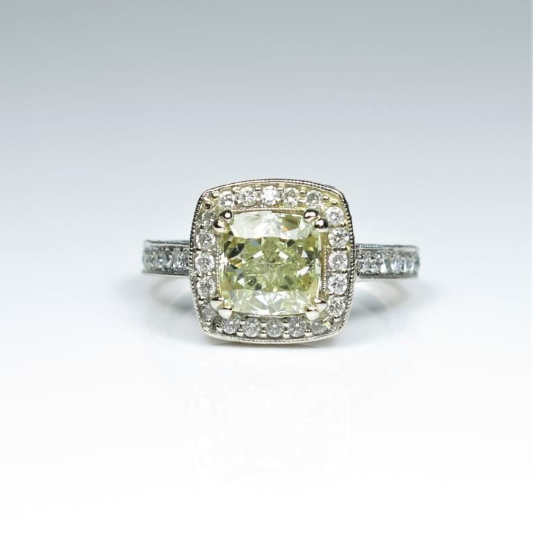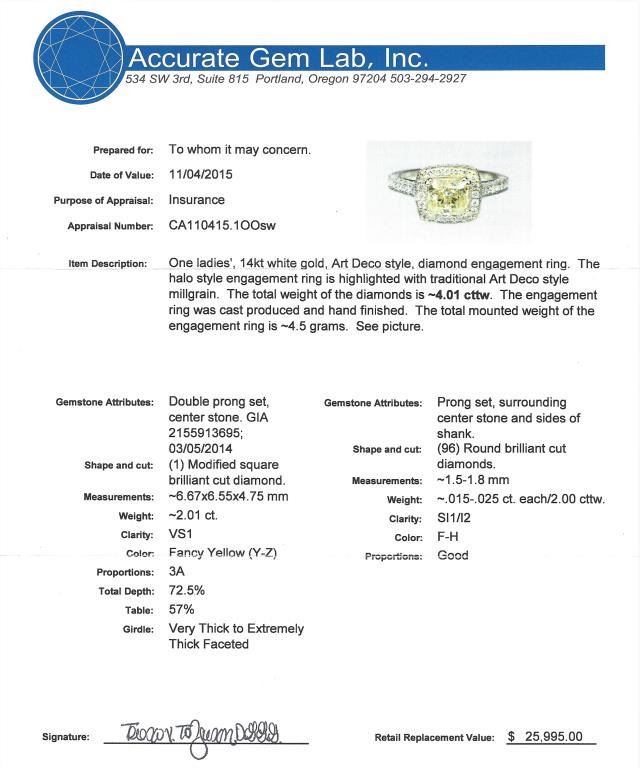 Exquisite Fancy Yellow and White Diamond Ring featuring a square brilliant cut Fancy Yellow Diamond weighing 2.01 carats with VS1 clarity accented with 96 round brilliant cut White Diamonds weighing 2.00 carats totalwith F-G colors and SI clarity set in a highly detailed Art Deco style setting of 14 karat white gold. Full Appraised Value - $24,000.00 Estimates $12,000-15,000