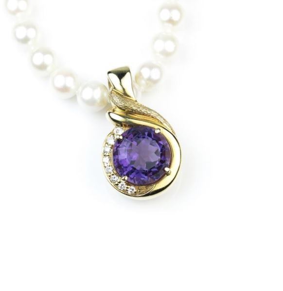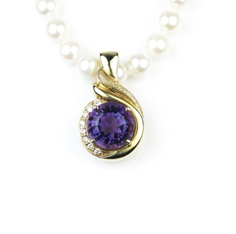 Featuring a fine round amethyst and diamond pendant with amethyst weight approx. 4.00 carats accented wit 8 'IDEAL' cut diamonds weighing approx. 0.25 carats of G-H colors and VS clarity and pearls averaging 6.00-7.00mm in dia. all in 14K yellow gold custom setting.