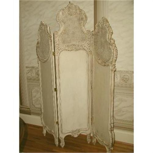 Exquisite Louis XV antique cream screen C.1875-80 has double caned panels in each of the three large 19W panels surrounded by carving of oyster shell,floral and acanthus leaf expertly done. Same coloring and motif front and back for use out in a room. Additional photos available. The caning as well as the rest of the screen in excellent condition with aged beautiful patina. New solid brass hinges have been added as the old were broken and unable to hold the panels. A stunning piece in any room.Measures 76H (center panel)68.5H (two side panels)X 58.5L X 1.5D.