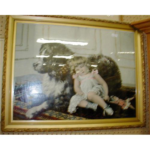 Incredible Victorian sleeping young girl lying against her large St. Bernard (I thiink)dog holding her doll. Gold frame is 2-1/2" and has a few minor black marks. Artisis name is in upper right hand corner. Lights are reflection from mall and camera lights. Colors are deep and rich. Buyer pays shipping and handling costs.