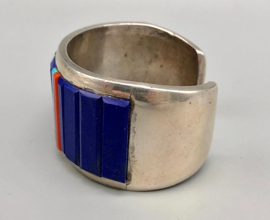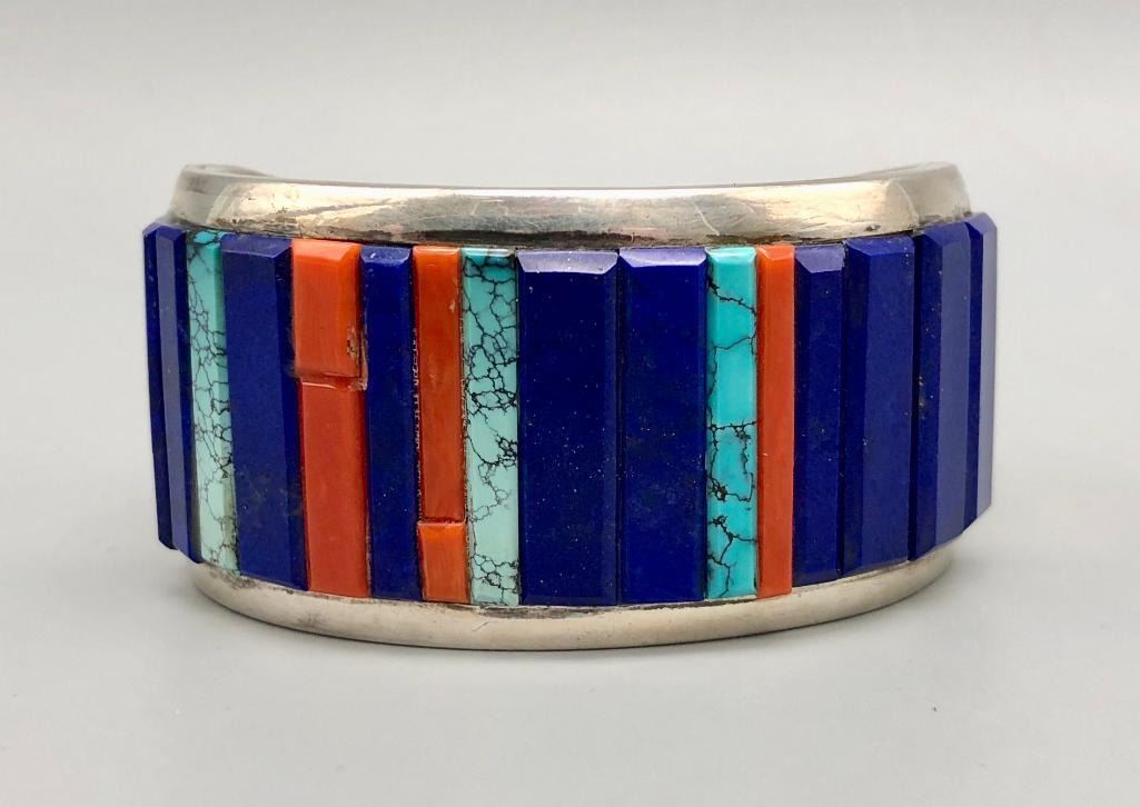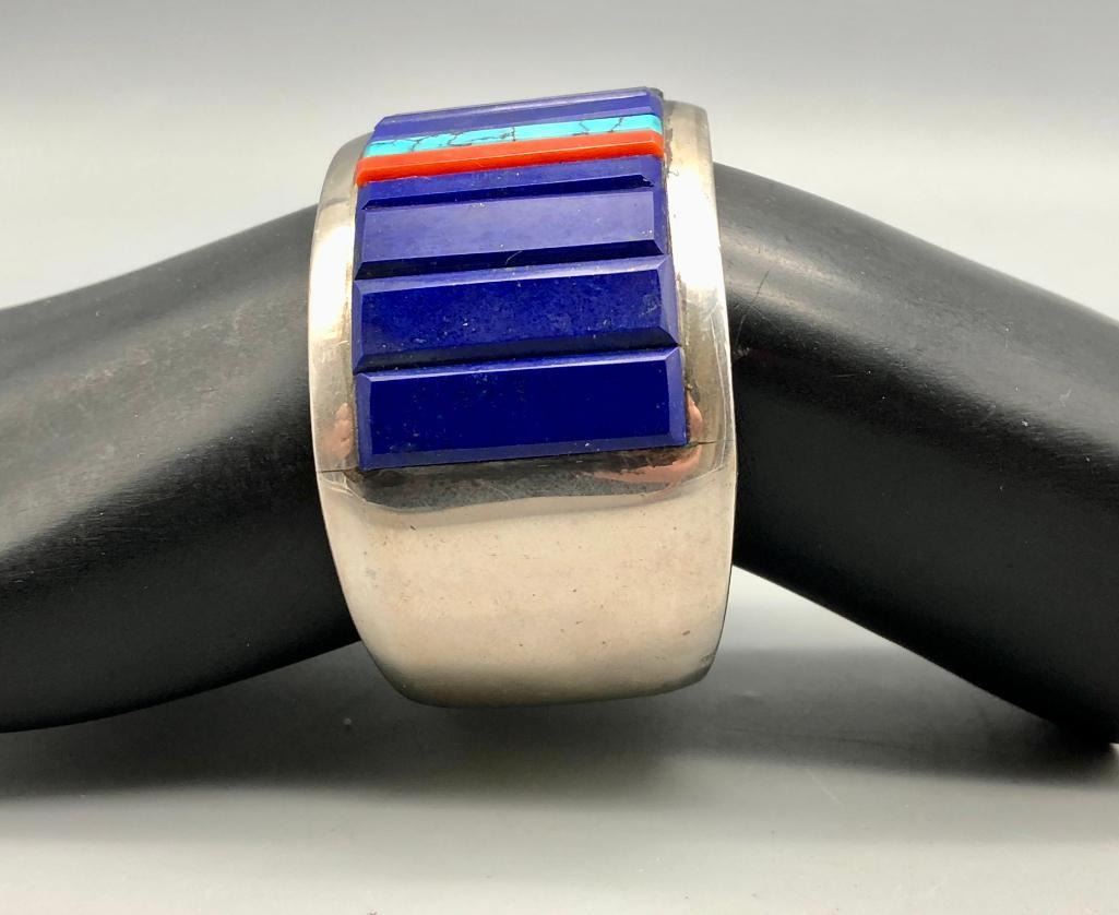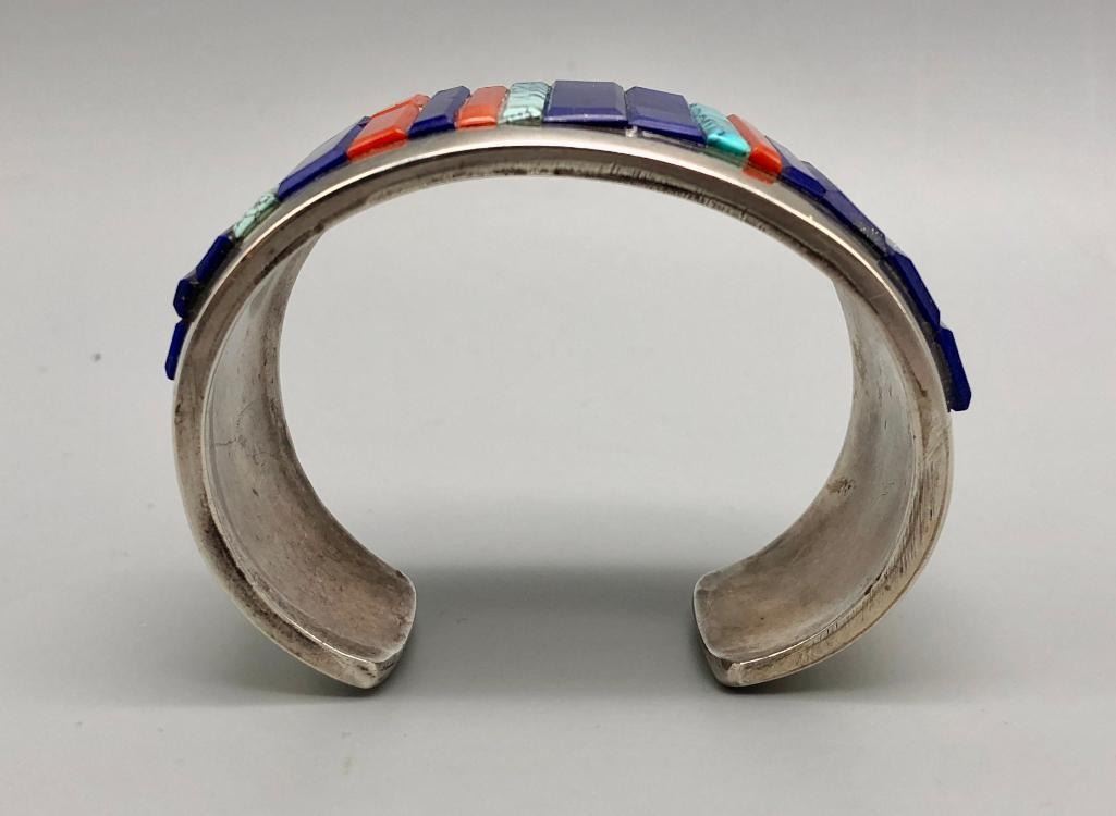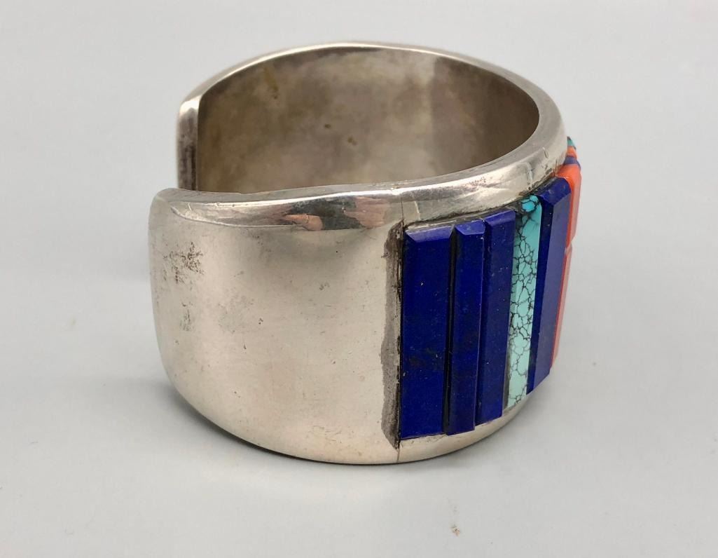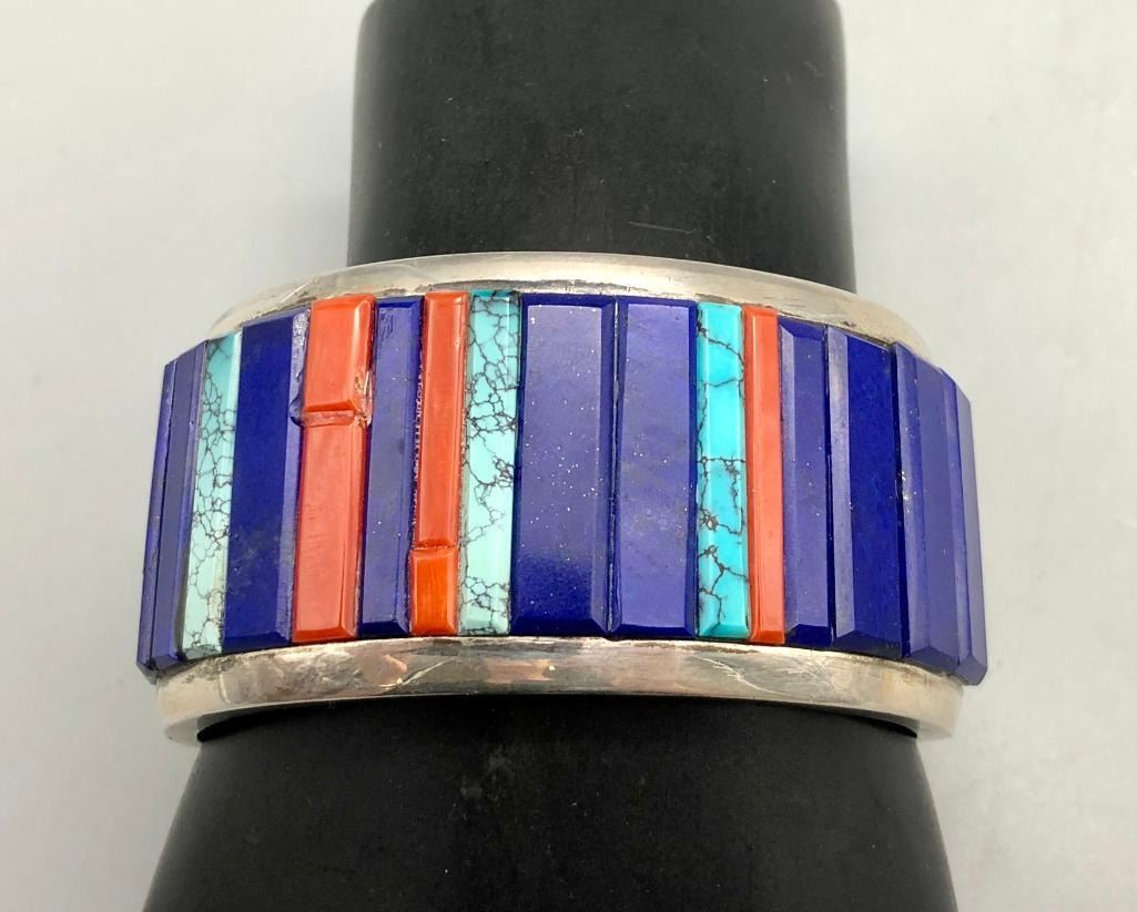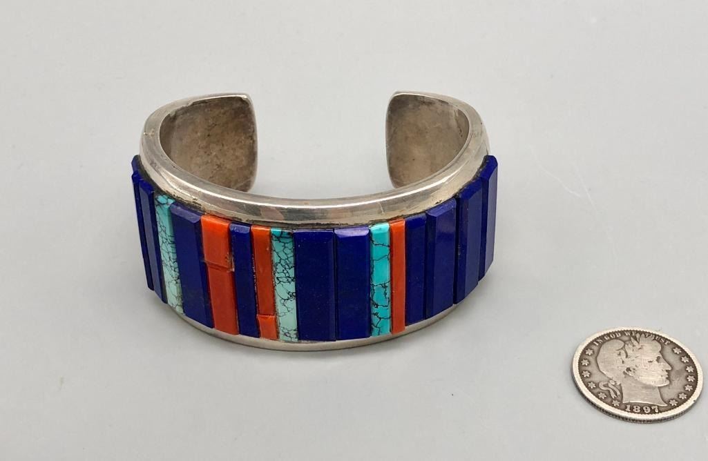 Up for consideration is an exquisite multi stone bracelet by Richard Begay. This gorgeous bracelet features channel inlay designs of lapis, coral and turquoise. It has a nice thick silver cuff, giving it a sturdy feel. It is stamped as sterling.  MAKER: Hallmarked RB. Richard S. Begay (1976-; Navajo). APPROX AGE: Contemporary. SIZE: Inside circumference measures 5-7/8 inches long. Opening is an additional 1-1/8 inch, fitting a 7 inch wrist. Width is 1-3/8 inches. Weighs 107.3 grams. CONDITION: Good for its age, normal wear expected. Please look closely at the pictures as they are an important part of our description and are hereby incorporated into the description, specifically with regards to condition. SHIPPING: There will be a $5 handling / packaging fee for shipping this lot. The actual cost of postage will be added on top of that. BUY IT NOW: If you would like to buy this item now, without waiting for the auction day to bid on it, we do offer this option (which is available up to 48 hours before the actual auction starts). The “Buy it Now†price is the high estimate of this lot (plus applicable fees and the Buyer's premium is discounted to 10% when using the Buy it Now option). If you would like to exercise this option, you must contact us by email (or phone as long as you talk to someone live). Reference this lot number and your intention to "Buy it Now."