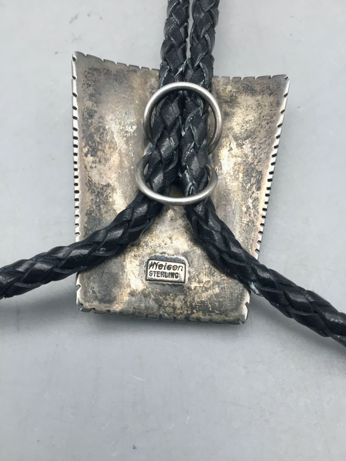 Description: For sale in this lot is a neat looking Navajo bolo tie with a stunning style and it is set with a great looking spiderweb turquoise stone. It is on a braided black leather cord with custom silver tips to match. Marked as sterling silver. Maker: Hallmarked Nelson. Approx. Age: Vintage. Size: Cords measure 44 inches long with tips. Slide measures 2-1/8 inches long x 1-3/4 inches wide. Weighs 84.6 grams. Condition: Good for its age, normal wear expected. Please look closely at the pictures - they are an important part of our description. Shipping: There will be a $5 handling, packaging fee for shipping this lot. The actual cost of postage will be added on top of that.