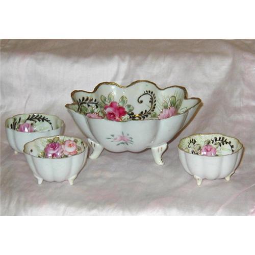 Signed Nippon Hand painted porcelain nut bowl set with 3 small bowls (l.75 Hx 3" W). Gold trimmed with pink/red roses inside - outside is white with single pink roses. Minor gold trim loss. Buyer pays shipping and handling costs.