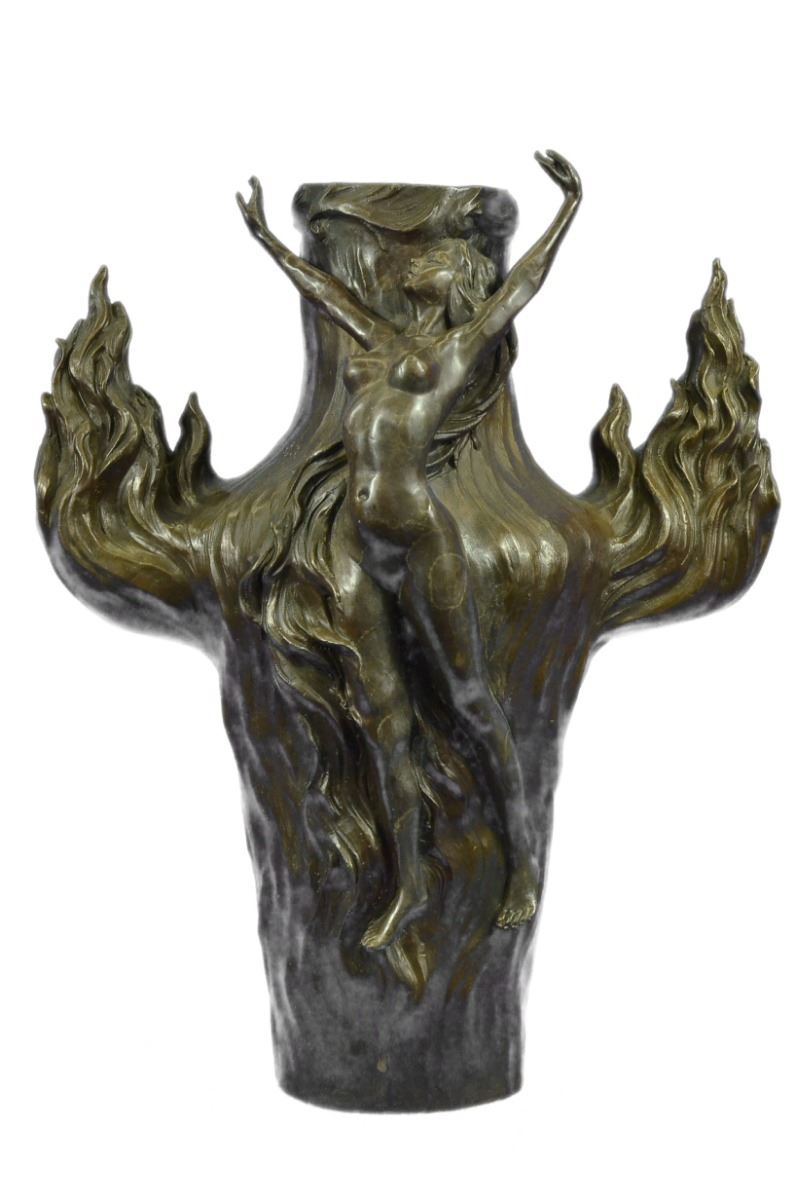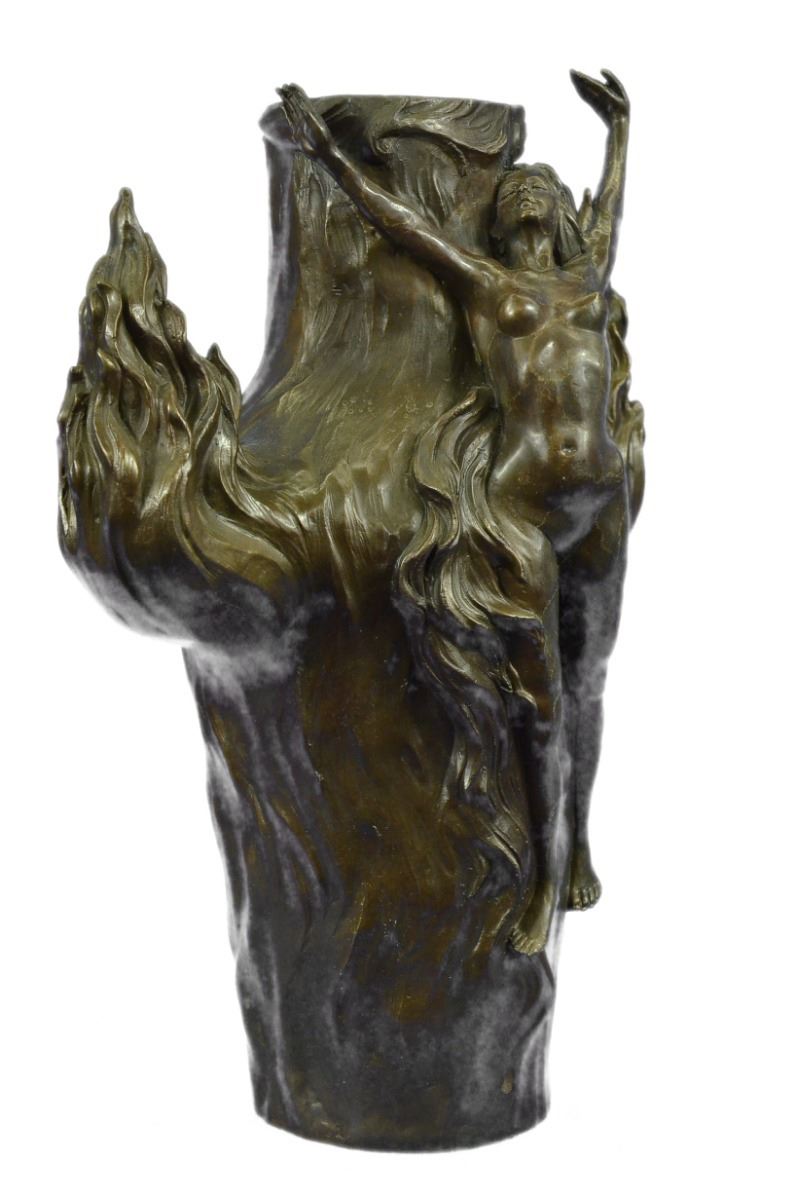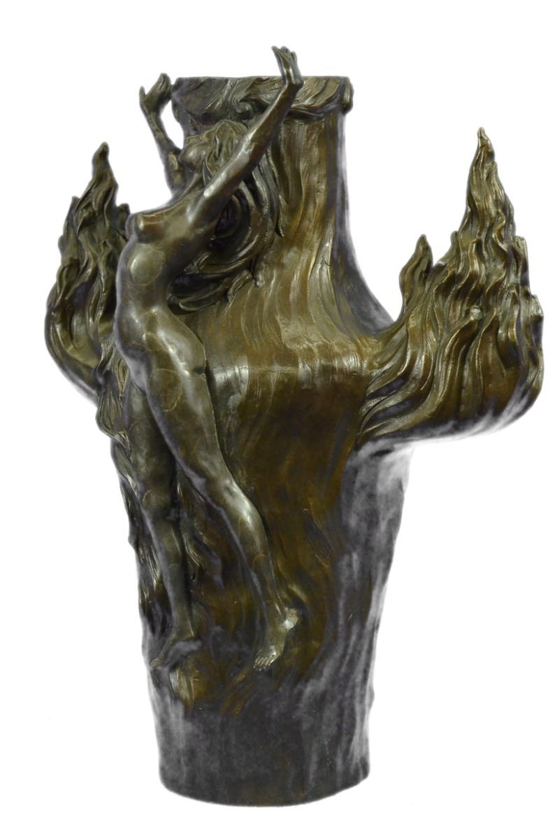 An exquisite vase that would be the center of attention in any room. Nude nymph surround the vase. The nymph seem to grow like blossoming flowers. Vines and flowers creep around her, almost a part of the vase. This unique piece can act as a flower pot or just an eyecatching addition to your abode. The vase itself is a brown patina. This Sculpture was cast using the Lost Wax Method and mounted on a marble base. Bronze Dimensions: Height 14 X Width 12 inches. Weight: 12 LBS.