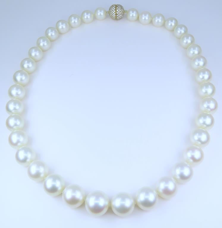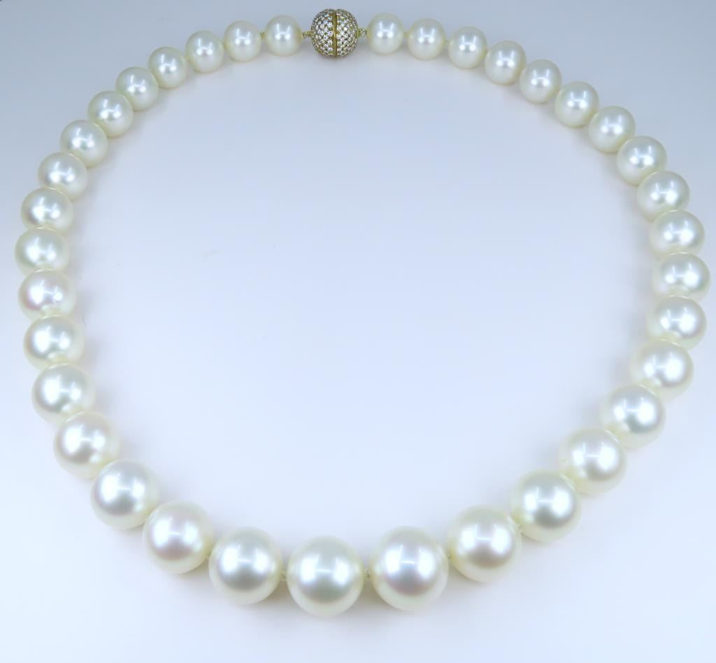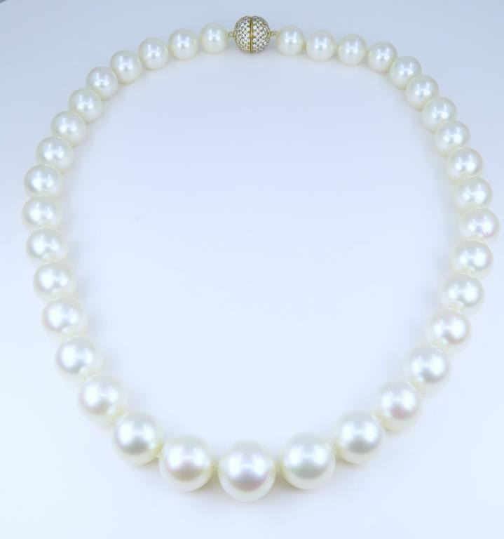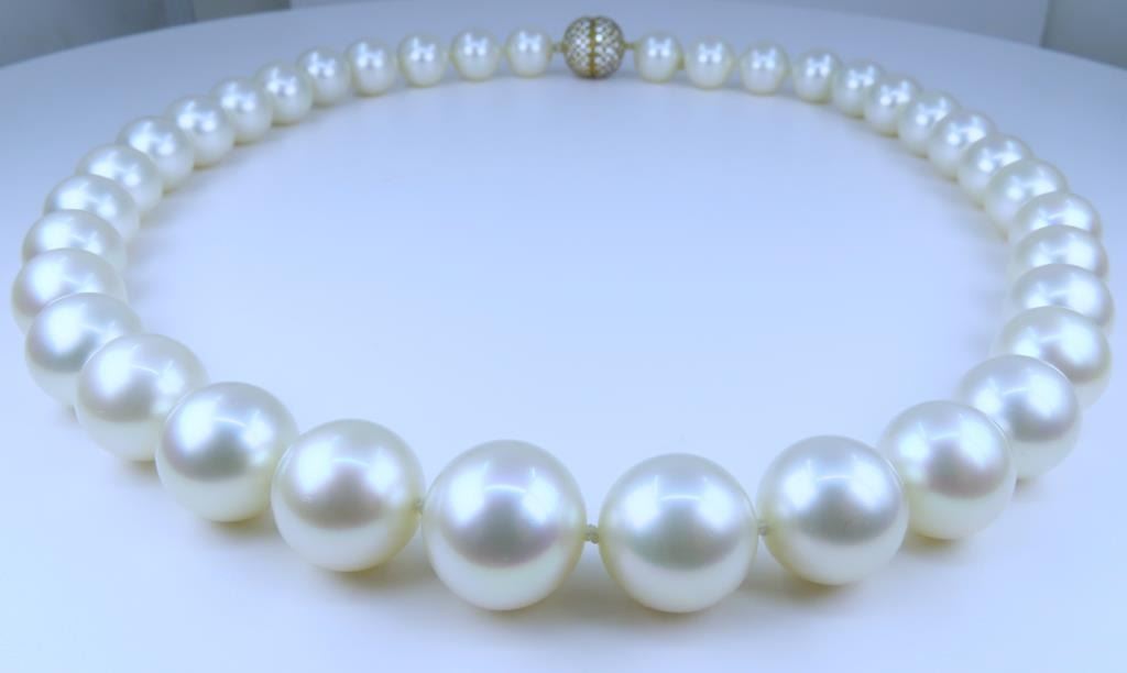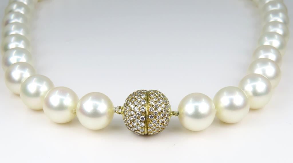 Fine Luxury, a Pearl Collector's Dream - Extremely Rare South Sea Pearl and Diamond Necklace featuring a G.I.A. certified Strand of White, perfectly shaped South Sea Pearls beautifully matched with luminous Pink and Green overtones with exceptional luster. Pink and Green color overtones are highly prized for their beauty and visual complexity. This extraordinary strand of Pearls graduate from 12.00 mm to 15.00 mm in diameters and weigh over 120 grams. South Sea Pearls are extracted from the finest ‘PINCTADA MAXIMA’ Mollusk, Rare because the Oyster must be 3-4 years old before it is large enough to be seeded for the first time. South Sea Pearls take between 2-4 years to fully develop one Pearl at a time, due to their long growth period South Sea Pearls develop a very thick Nacre or skin often between 2 to 4 mm. This gorgeous Pearl Necklace is accented with an impeccably crafted, very fine Diamond studded ball clasp encrusted with approx. 320 pave set Diamonds weighing approx. 3.20 carats with F-G colors and VVS/VS clarity set in 18 karat yellow gold. Top Quality Luxury Jewelry Collectors Piece. Full Retail Appraised Value - $80,000.00.