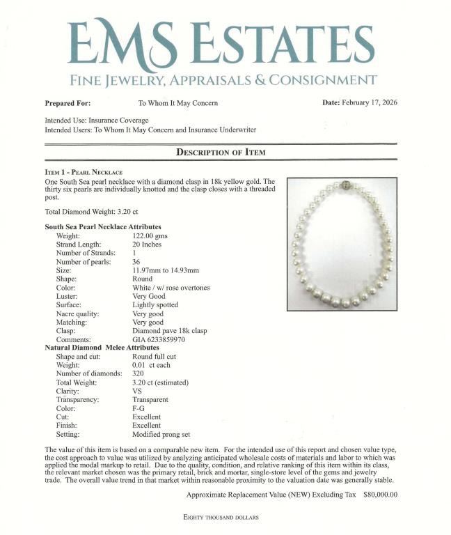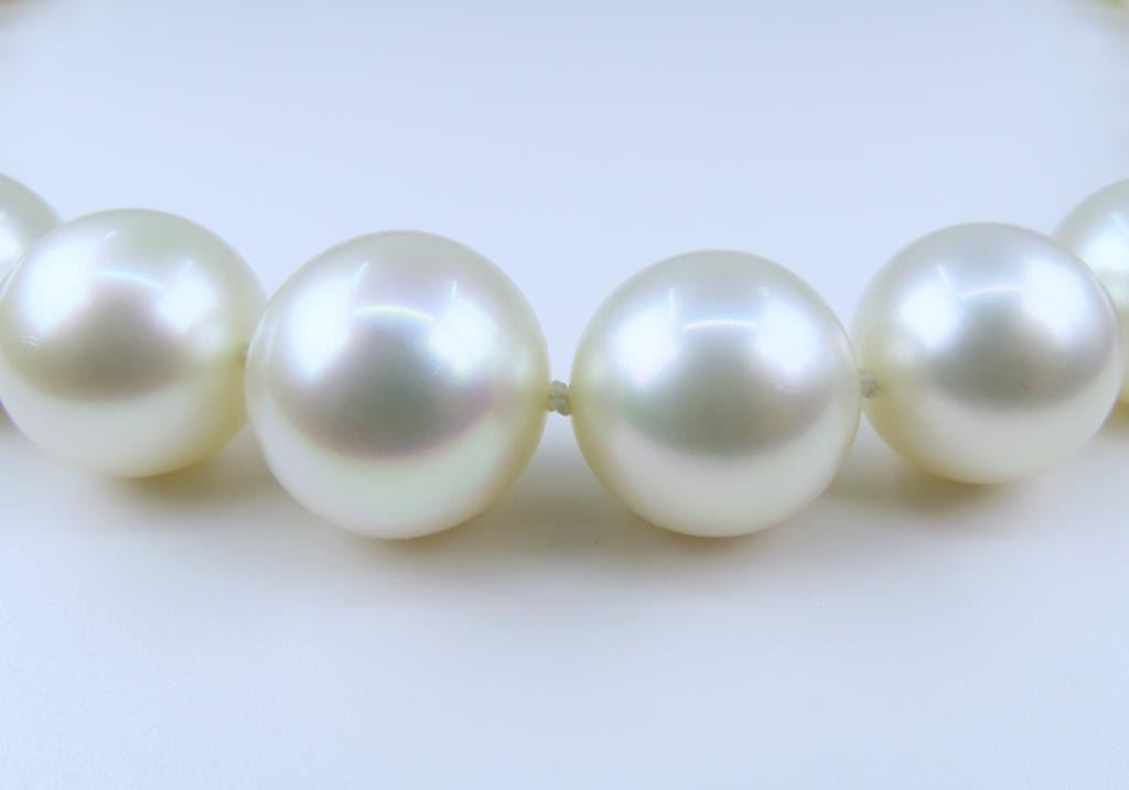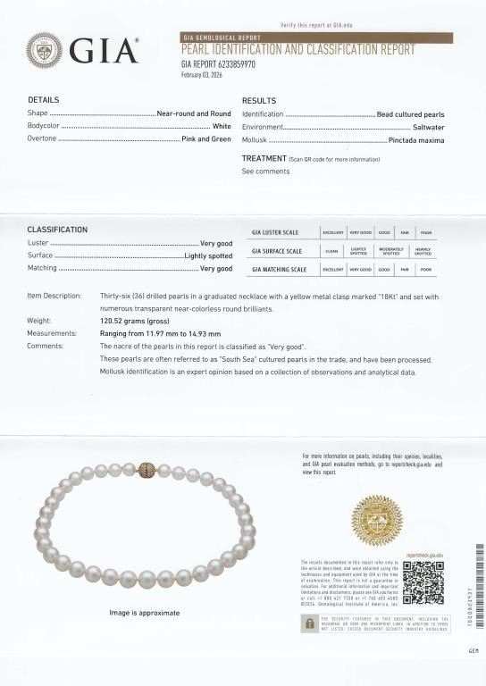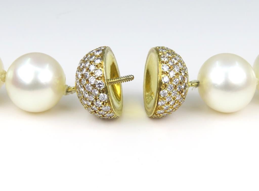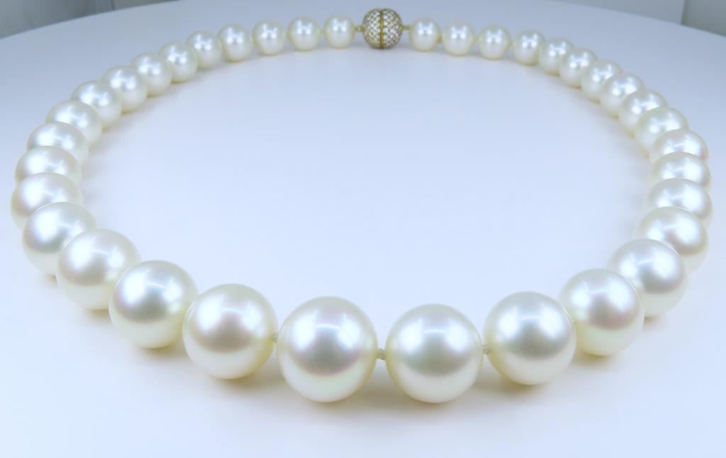 Fine Luxury, a Pearl Collector's Dream - Extremely Rare South Sea Pearl and Diamond Necklace featuring a G.I.A. certified Strand of White, perfectly shaped South Sea Pearls beautifully matched with luminous Pink and Green overtones with exceptional luster. Pink and Green color overtones are highly prized for their beauty and visual complexity. This extraordinary strand of Pearls graduate from 12.00 mm to 15.00 mm in diameters and weigh over 120 grams. South Sea Pearls are extracted from the finest ‘PINCTADA MAXIMA’ Mollusk, Rare because the Oyster must be 3-4 years old before it is large enough to be seeded for the first time. South Sea Pearls take between 2-4 years to fully develop one Pearl at a time, due to their long growth period South Sea Pearls develop a very thick Nacre or skin often between 2 to 4 mm. This gorgeous Pearl Necklace is accented with an impeccably crafted, very fine Diamond studded ball clasp encrusted with approx. 320 pave set Diamonds weighing approx. 3.20 carats with F-G colors and VVS/VS clarity set in 18 karat yellow gold. Top Quality Luxury Jewelry Collectors Piece. Full Retail Appraised Value - $80,000.00.