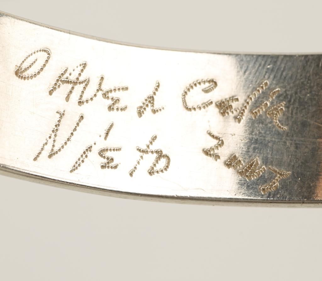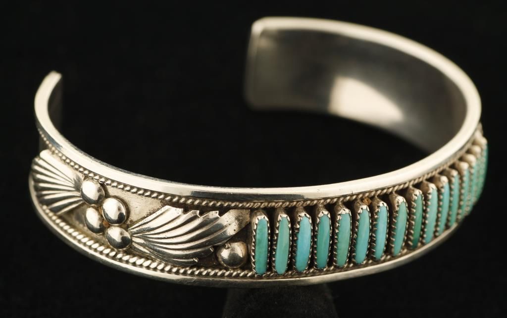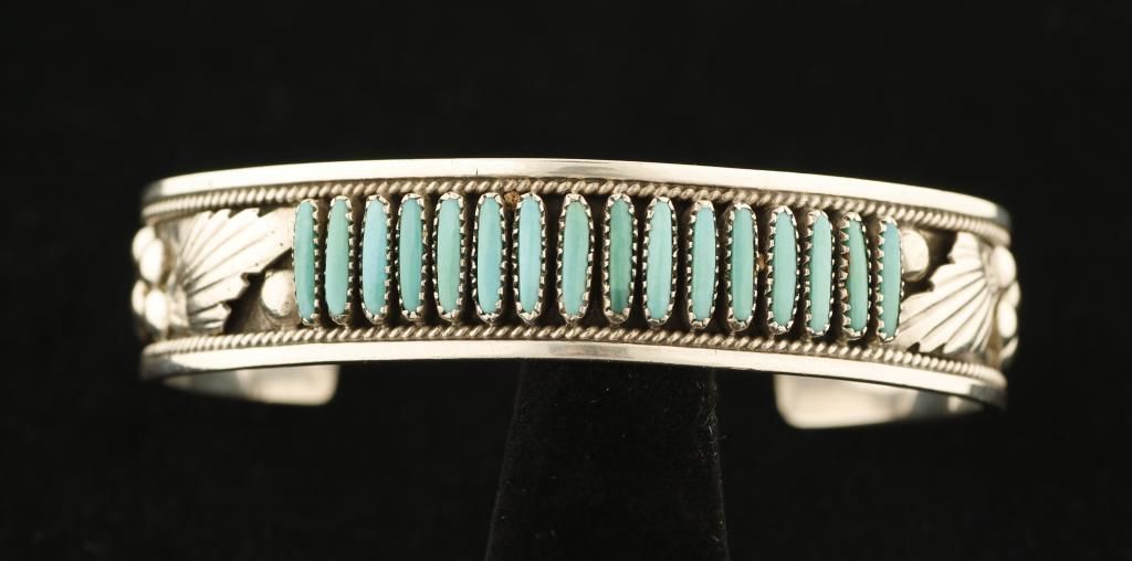 Silver turquoise pettipoint cuff by Zuni artists Dave & Celia Nieto. The cuff features leaves and raindrops symbolizing growth and prosperity. Dave & Celia (husband & wife) made jewelry from 1962-1980's. They live in Zuni Pueblo, NM. The cuff measures about 5-1/3" with a 1-1/4" gap. Signed "Dave & Celia Nieto Zuni".