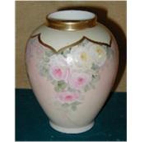Lovely and delicate pink porcelain vase with roses. Looks to be hand painted and European. Flowers pink and white with green leaves. There is some gold paint loss on top rim. Buyer Pays shipping and handling costs.