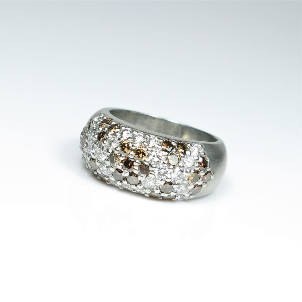 Ring featuring 26 pave set ‘IDEAL’ cut white Diamonds weighing approx. 1.00 carat with F-G colors and VS/SI clarity and 27 ‘IDEAL’ Fine chocolate Diamonds weighing approx. 1.30 carats total Diamond weight 2.30 carats set in 15.5 grams of Platinum. High Quality Piece. Retail $5,000-$6,000