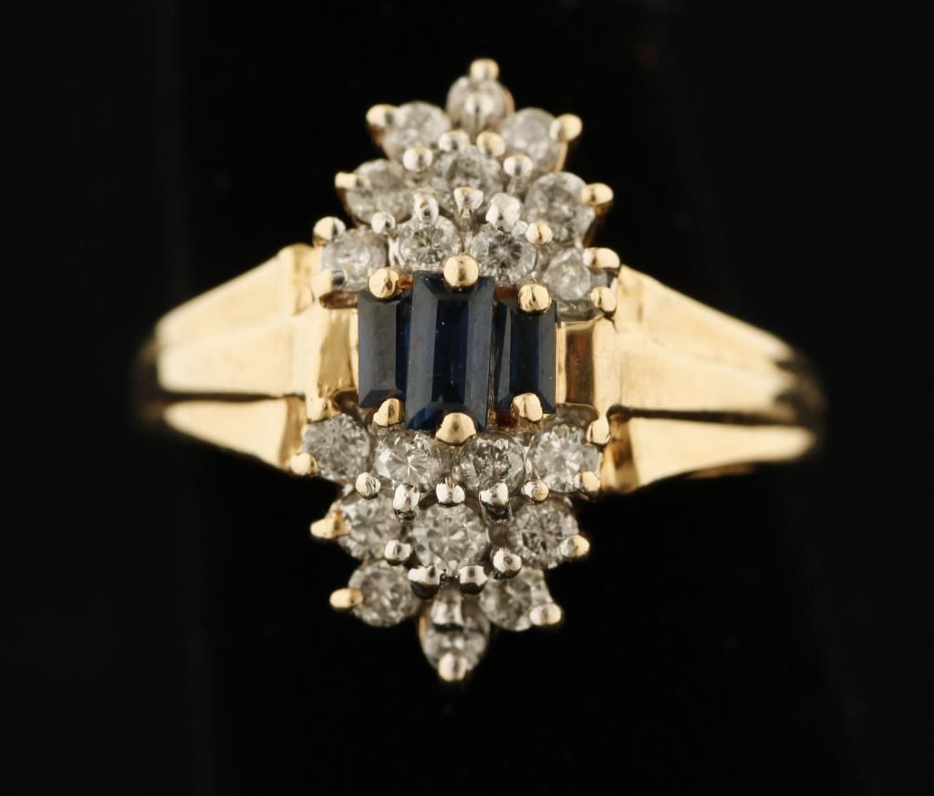 This 14K sapphire and diamond ring features 3 baguette cut royal blue sapphires that total about 0.75 carats. They are accented by a little over 1/2 ct of SI or better, G-H diamonds. All set in 14K gold mounting (the gold hallmark was removed during sizing, but electronically tested as 14K) that weighs 3.7 grams & is size 5-1/4. This is a high quality piece that you will be proud to wear.