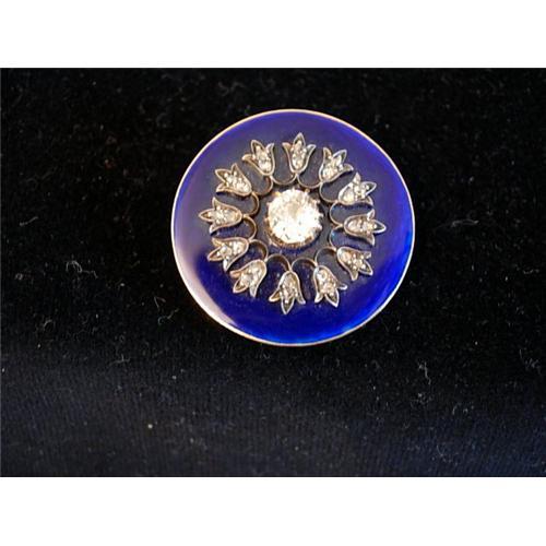Lovely circa 1880 Victorian diamond blue enamel and yellow gold round brooch centrally set with one .90 ct Old European Cut Diamond surrounded by "daisy" settings accented with 12 small rose cut diamonds lovely blue enamel background yellow gold mount - reverse pin stem assembly (modified). Lovely piece. Very good condition!