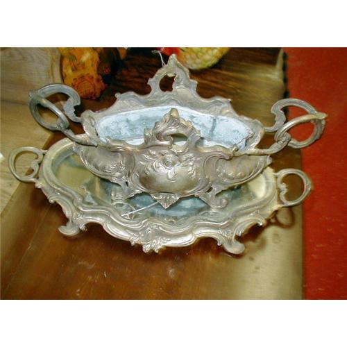 Lovely 2 pc. silver metalware (cast iron or sphelter) dresser set. Planter or for jewelry is 15"Lx6"Wx8"H - Mirror is 20Lx10Wx2-1/2H. Great detail and curves to this set. Unfortunately mirror has a crack, but can be replaced. Some scratches and marks which do not detract from beauty of set. Buyer pays shipping and handling costs.
