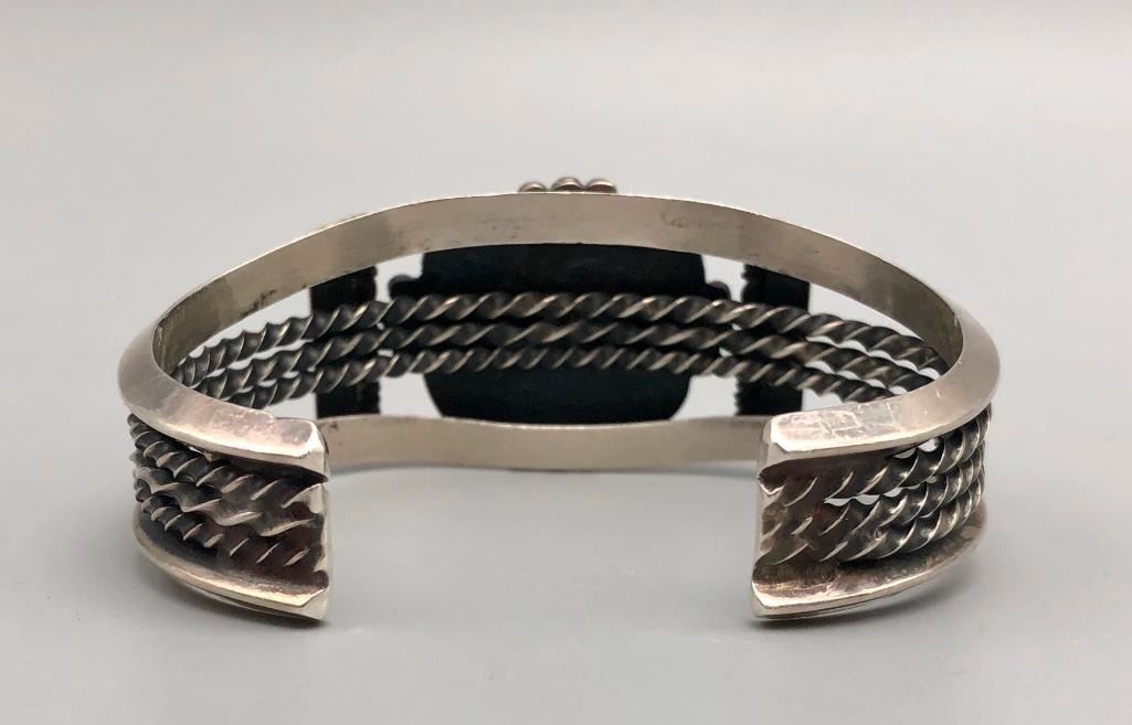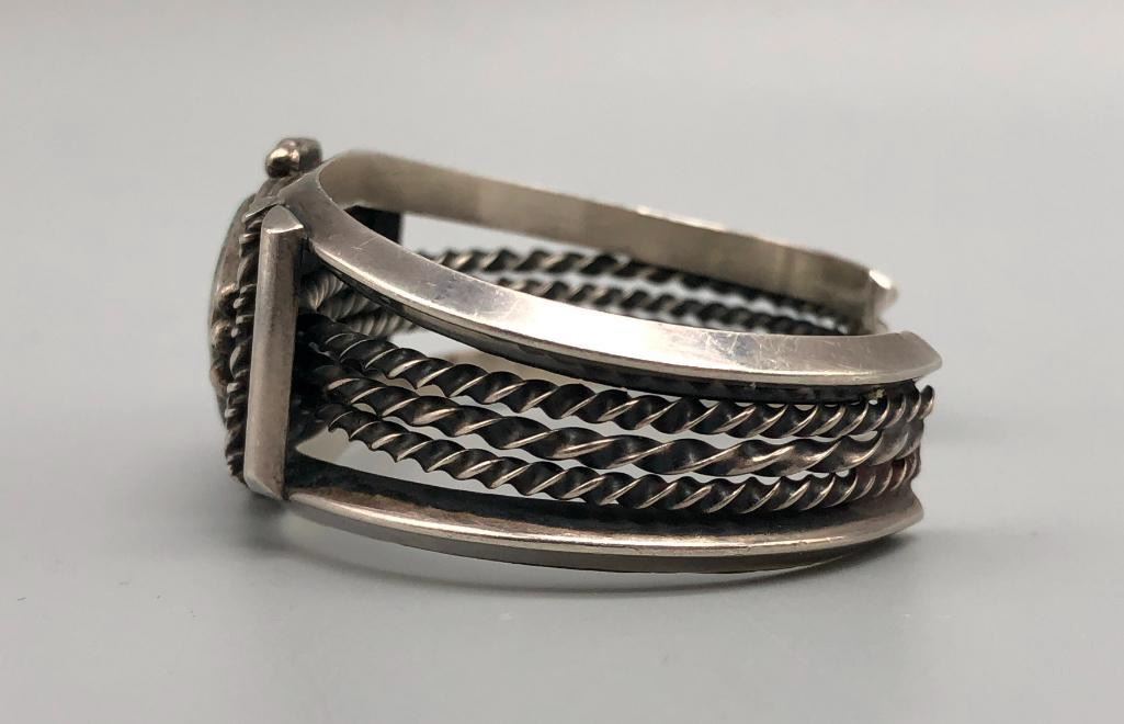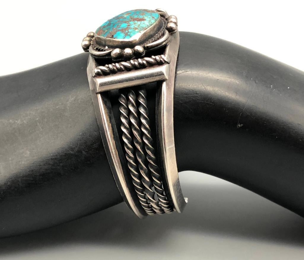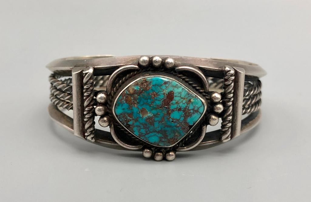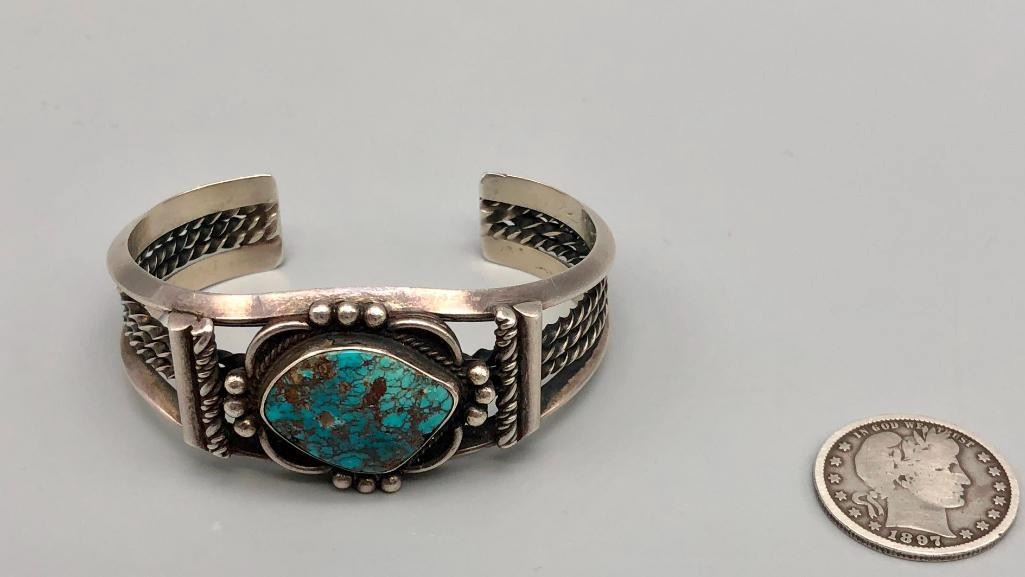 Up for consideration is this exquisite vintage Bisbee turquoise and sterling silver bracelet. It features a twisted wire and triangular cuff, set with a high grade Bisbee turquoise cabochon with silver dots accenting the setting. Made from sterling silver and has a nice weight to it. MAKER: Unmarked. APPROX AGE: Circa 1960s. SIZE: Inside circumference measures 5-1/4 inches long. Opening is an additional 1-1/8 inch, fitting a 6-3/8 inch wrist. Width is 1 inch. Weighs 45.3 grams. CONDITION: Good for its age, normal wear expected. Please look closely at the pictures as they are an important part of our description and are hereby incorporated into the description, specifically with regards to condition. SHIPPING: There will be a $5 handling / packaging fee for shipping this lot. The actual cost of postage will be added on top of that. BUY IT NOW: If you would like to buy this item now, without waiting for the auction day to bid on it, we do offer this option (which is available up to 48 hours before the actual auction starts). The “Buy it Now” price is the high estimate of this lot (plus applicable fees and the Buyer's premium is discounted to 10% when using the Buy it Now option). If you would like to exercise this option, you must contact us by email (or phone as long as you talk to someone live). Reference this lot number and your intention to "Buy it Now."