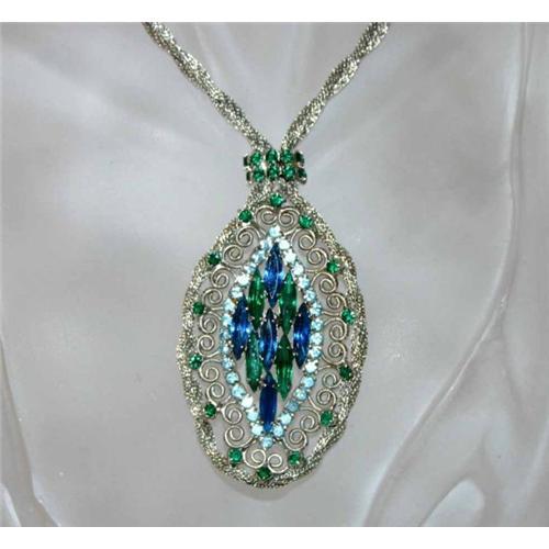 This is an absolutely gorgeous vintage Necklace produce in the 1940s-50s. Beautiful Emerald Green and Sapphire Blue Navette Rhinestones surrounded by Baby Blue Chaton Rhinestones framed in a fabulous open silver metal scroll work and twisted rope motif. The two mesh robe chains continue making the 25 inch long Necklace, securing with a C hook closure. All stones are foil-backed and prong set in a closed back Rhodium plated metal. Exquisite design and craftsmanship; pendant measures 3 inches long by 1 ¾ inches wide. Weighty, unique and gorgeous!