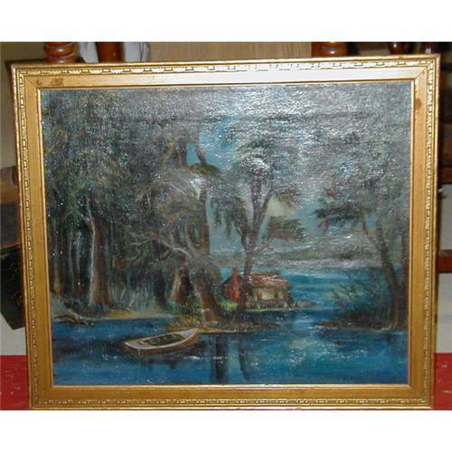 Exquisite oil painting in deep blues of swamp/water scene - house, boat. Trees are haunting. Gold frame is 1-1/4" and has some red marks. Few repairs on back, well done, do not detract from front of painting. Glare and shine is from camera flash. Buyer pays shipping and handling costs.