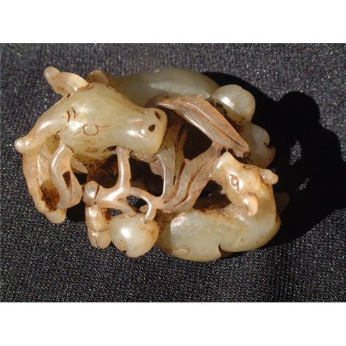 Qing period celadon jade carving in high relief and open work featuring a deer with its offspring, holding in its mouth a branch of peach tree with 3 peaches. The deer and peaches are symbols of longevity and this carving is a representative of good luck and longevity for wearer. Size: 2.5" X 2.3" (6.5 X 6 cm.).