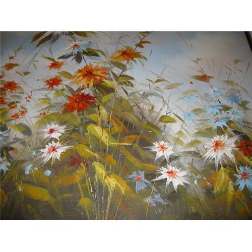 this painting is magnificent, and the signature on the lower right unverifiable. painting is gorgious with sky blue background,multi color flowers with a butterfly as a focal point. exotic and enlighting. in square shape, very good condition just few nails on the frame when was on the ceiling. the frame is thin black.(1.5"). it measures with the frame, 41.5 inch each side, without the frame is 40 inch. decorative,delightful and collectible.