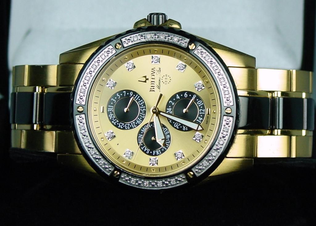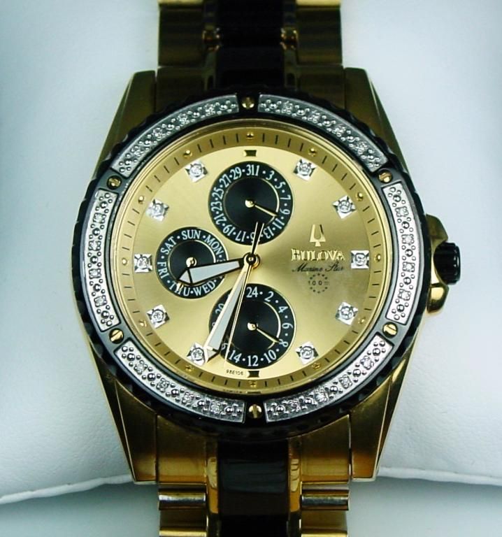Exquisite gents gold-tone ‘Marine Star’ Bulova watch with 34 round diamonds on face and bezel. Retail $1,000-$1,500 Estimate $500-$800 Fine condition