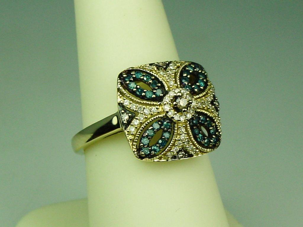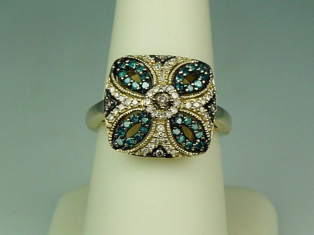 Exquisite ornate 14 karat yellow gold ladies  ring fine set with over 71 round white and  enhanced color blue diamonds weighing approx.  0.80 carats. Retail $1,950.00 Estimate  $500-$1,000