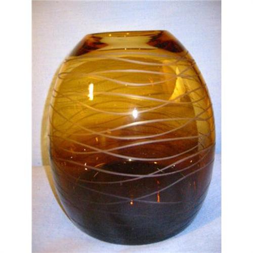 this amber colored vase is designed with white lines, and is hand blown. it has a signature and in excellent condition. it has no chip or crack, just normal wear and tear. it is murano italian style, and difficult to identify the signature. it is made of a superb quality glass, and measures about 9 inches tall,with 6.5 inches in base,and 3.5 inches on the neck in diam. it is beautiful and decorative.